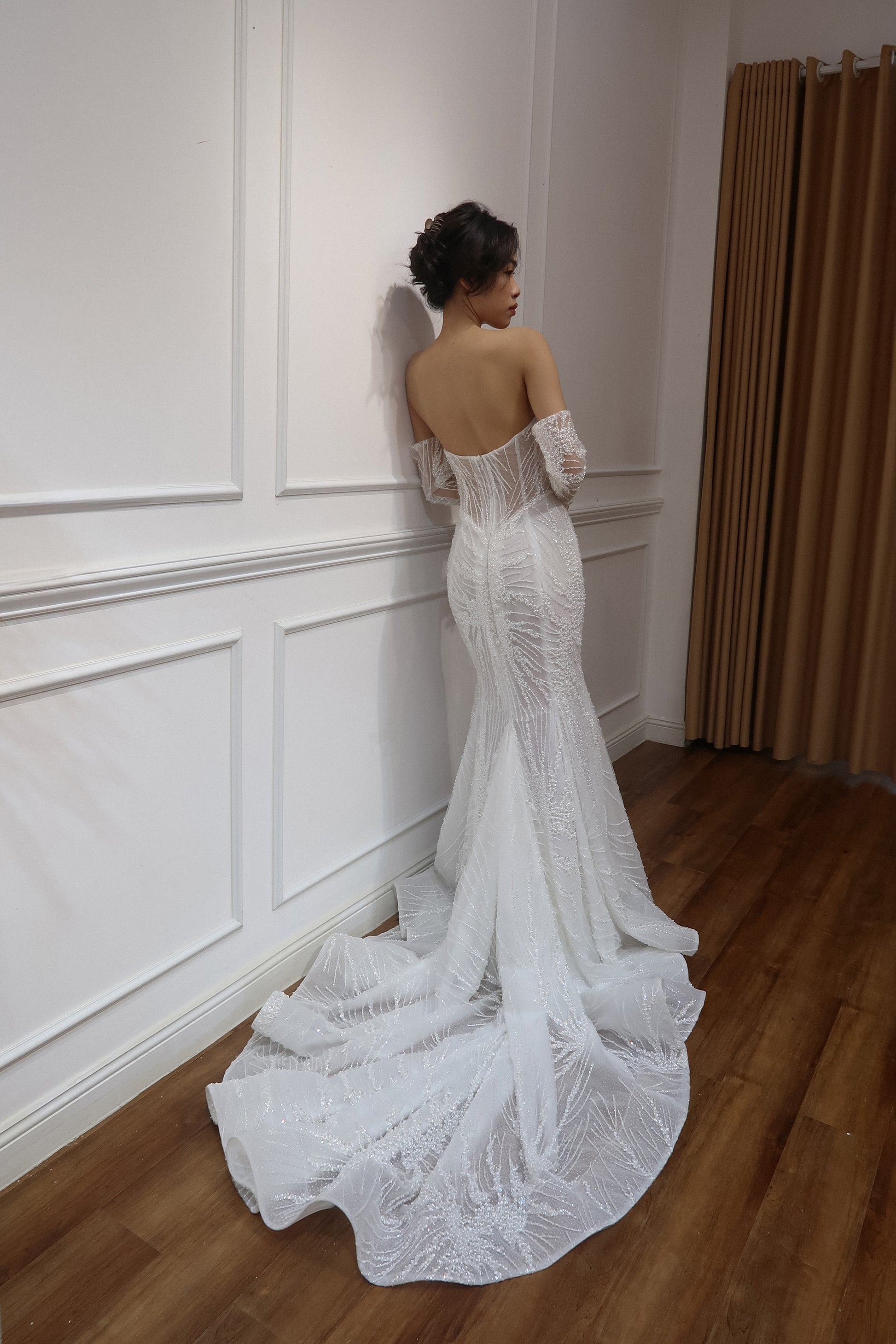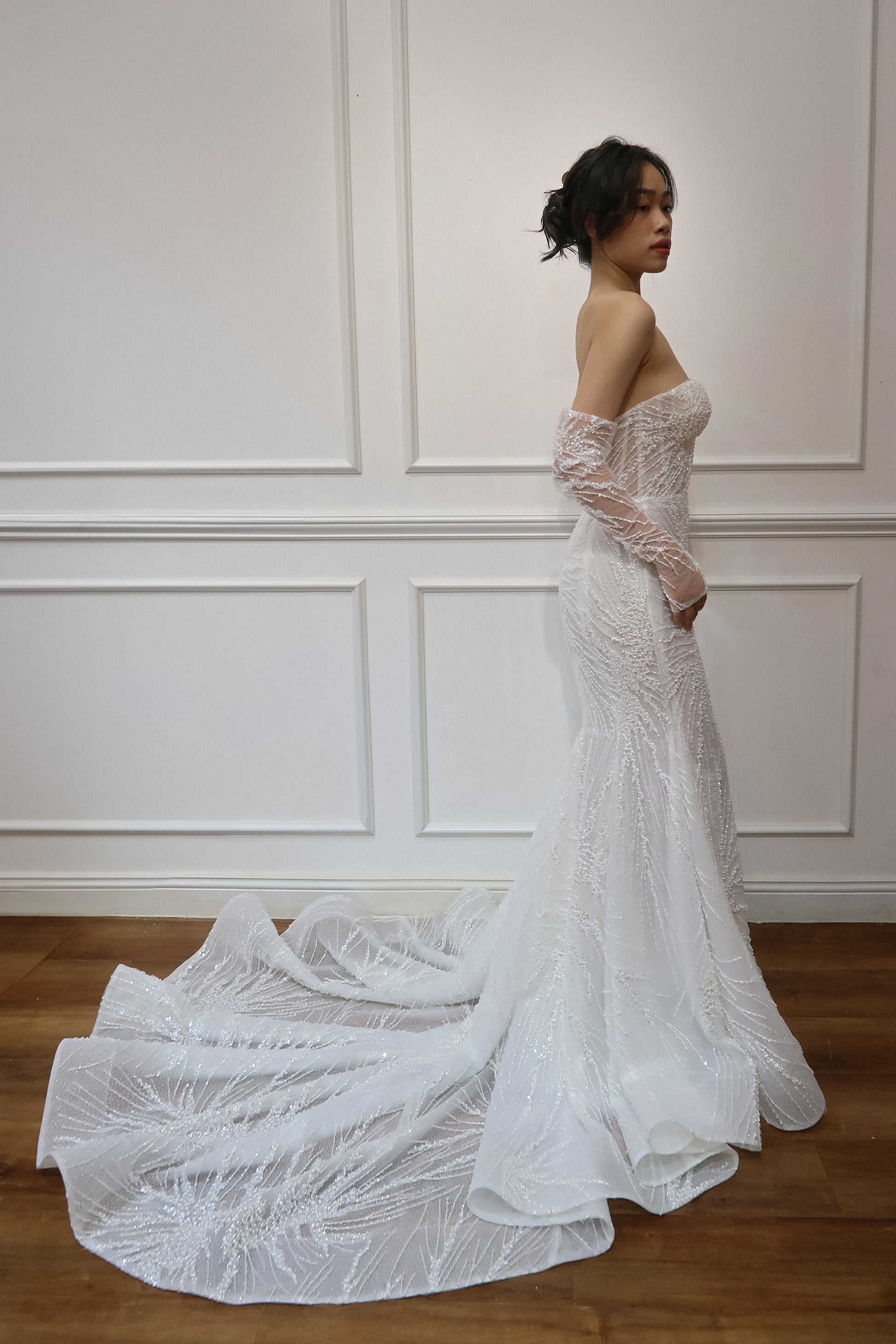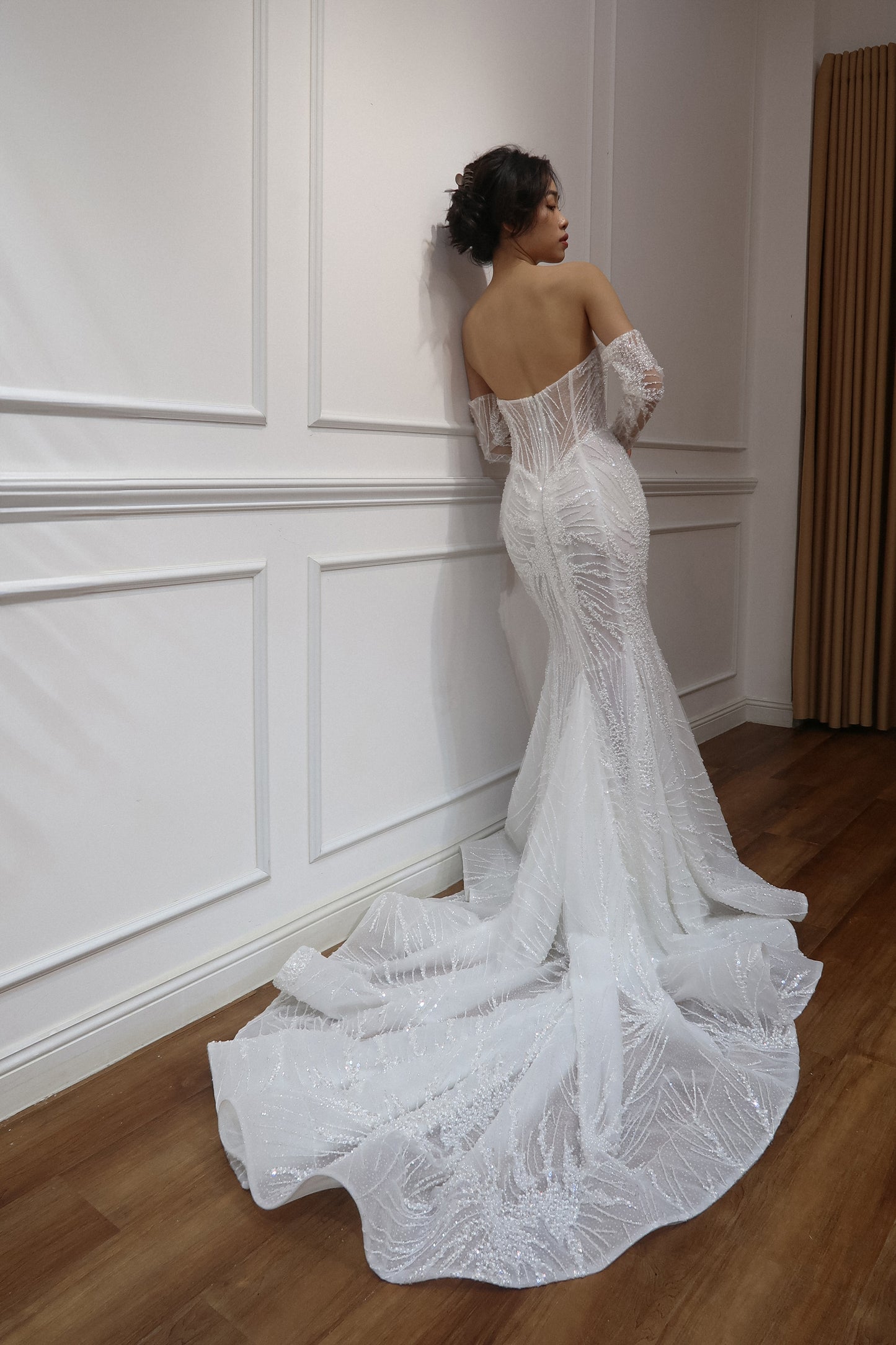 Fully beaded with pearls and crystals on the top, and crafted from luxurious sparkle fabrics, this mermaid wedding dress combines glamour and allure.