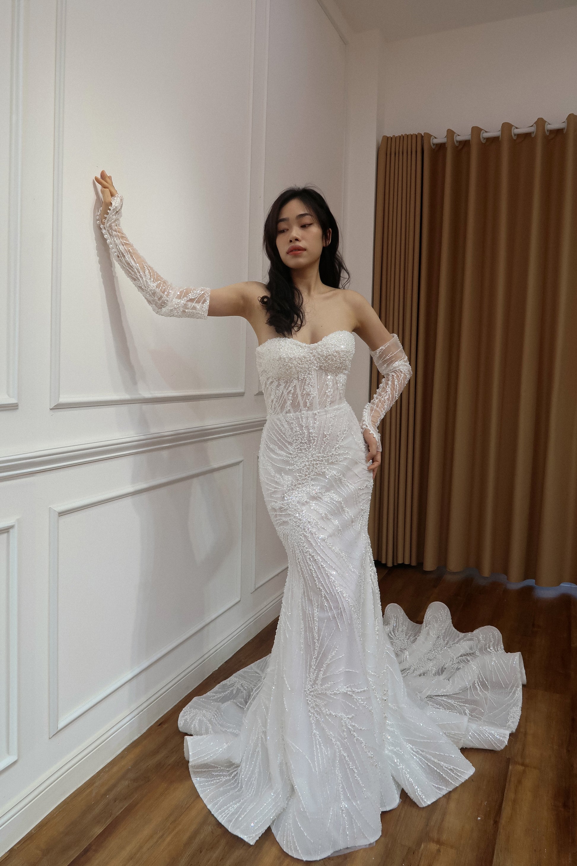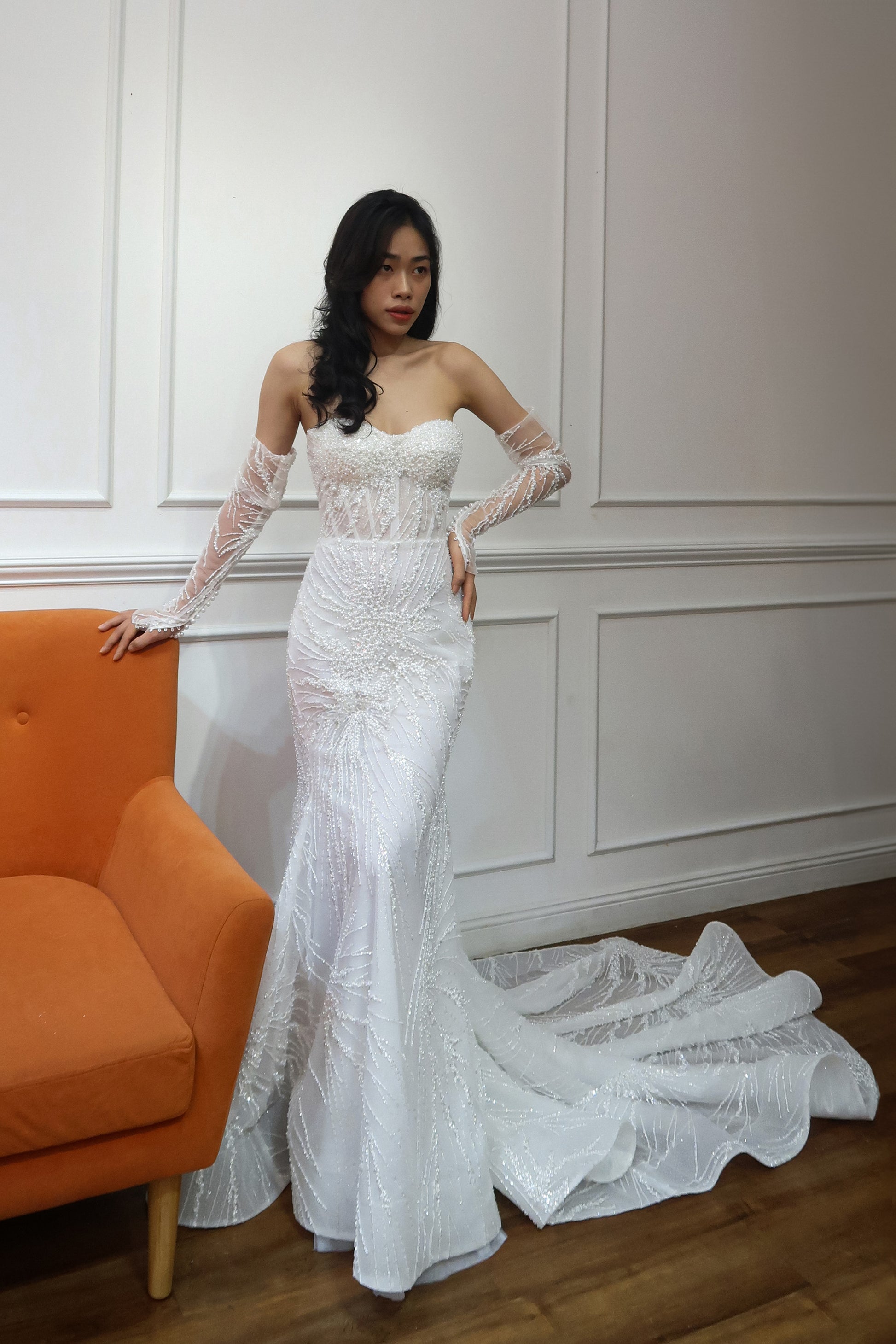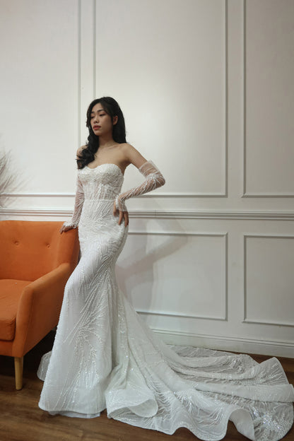 Fully beaded with pearls and crystals on the top, and crafted from luxurious sparkle fabrics, this mermaid wedding dress combines glamour and allure.