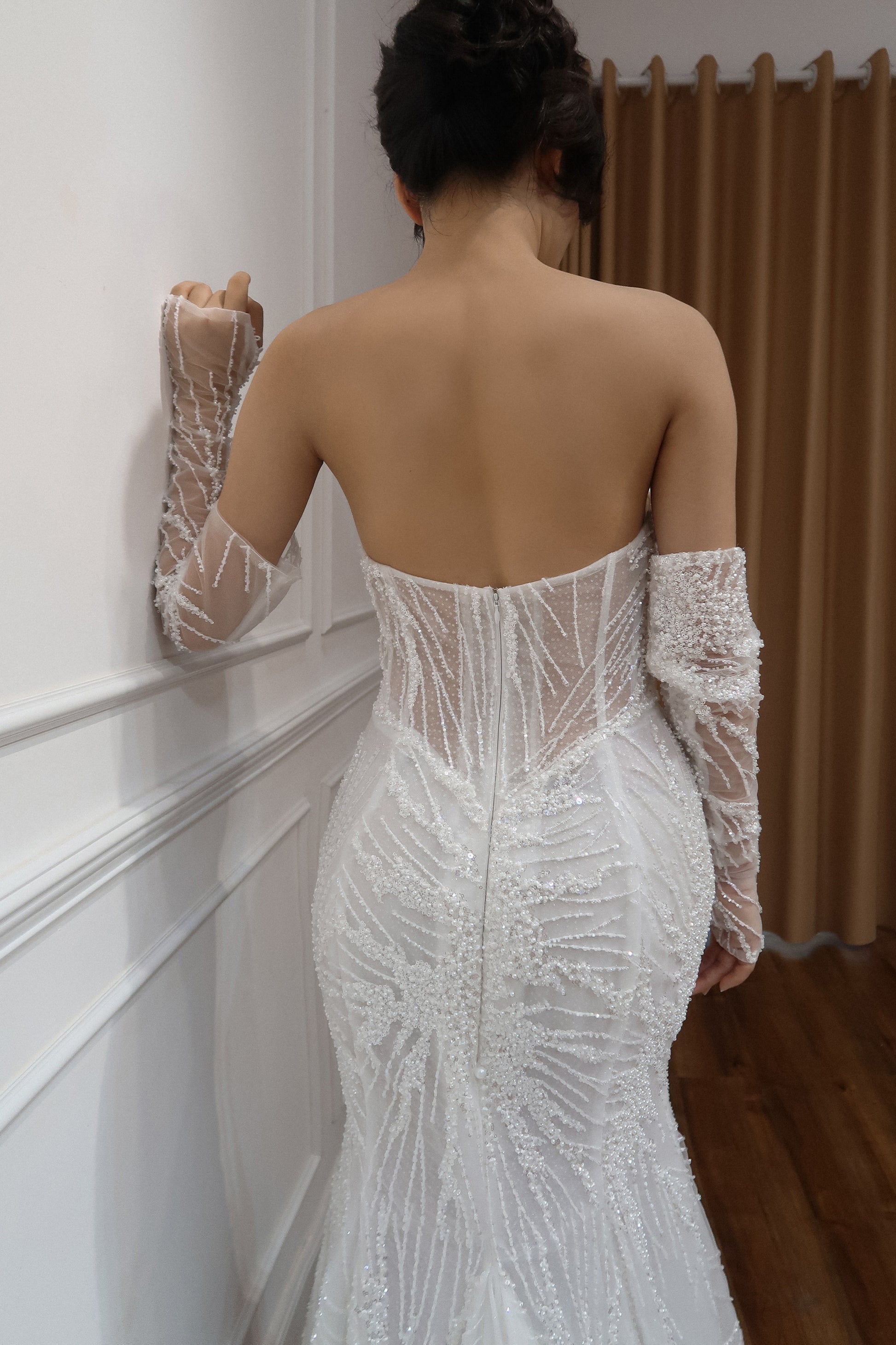 This elegant gown features a strapless sweetheart neckline with boning structure corset and detachable long sleeves for versatile styling.