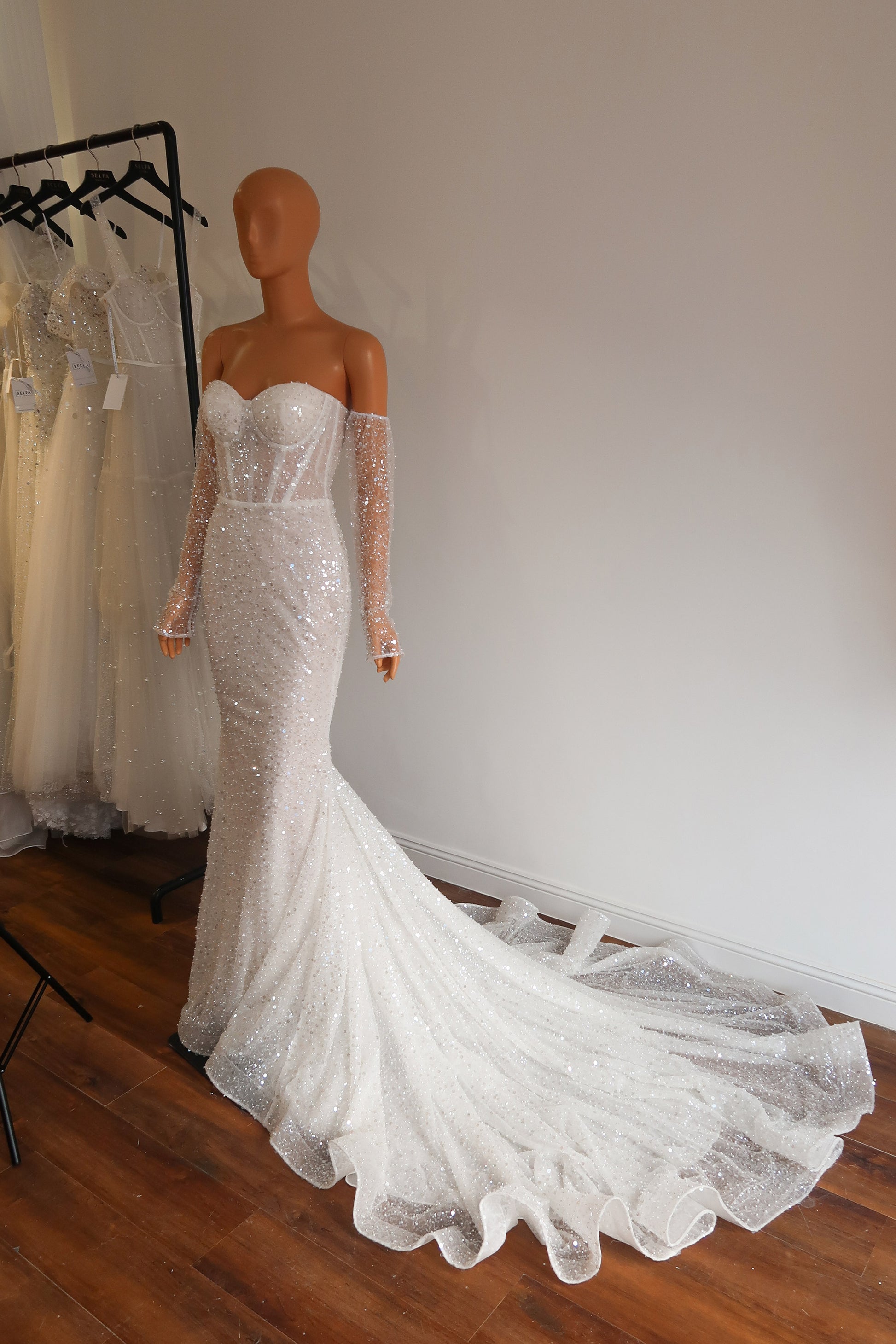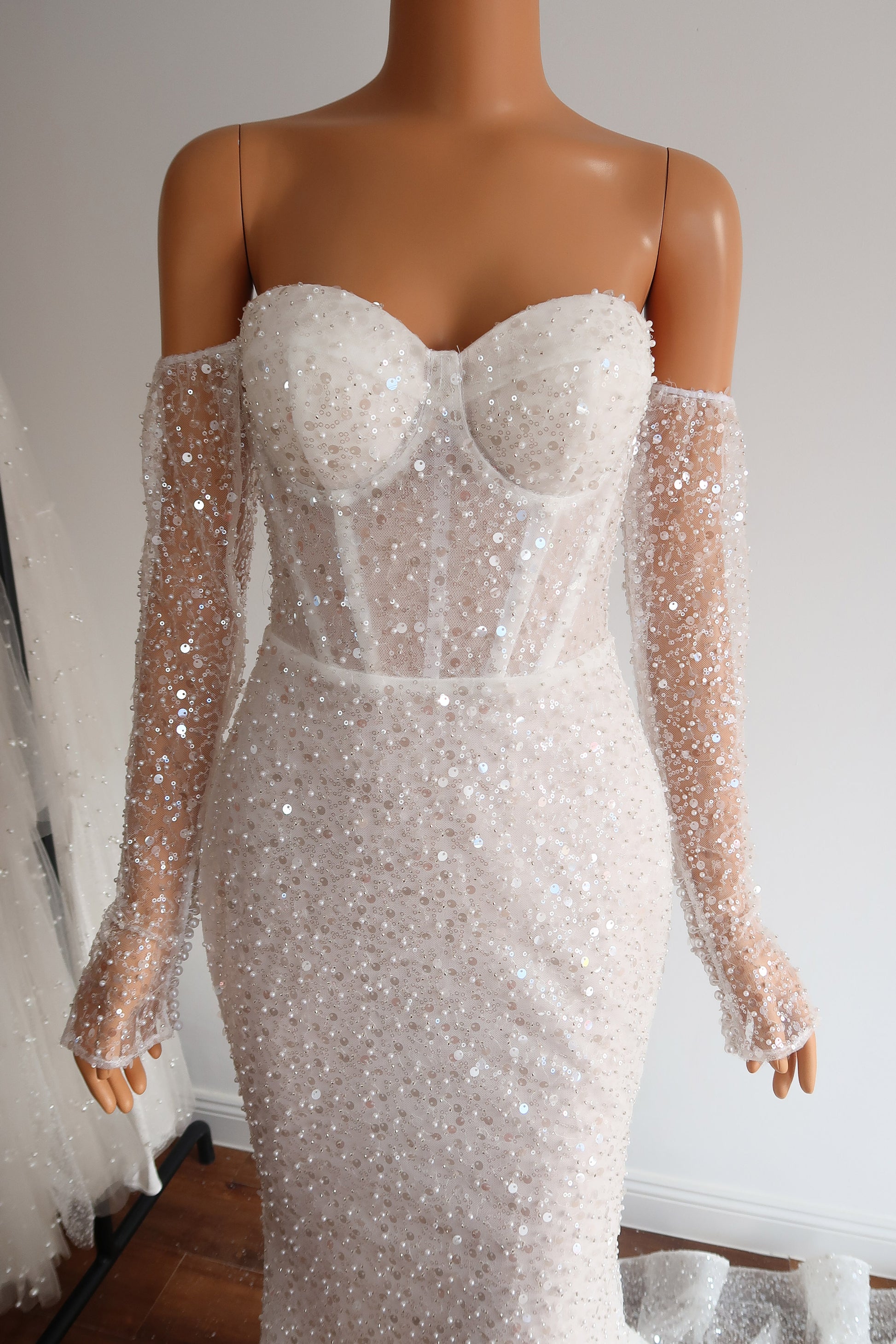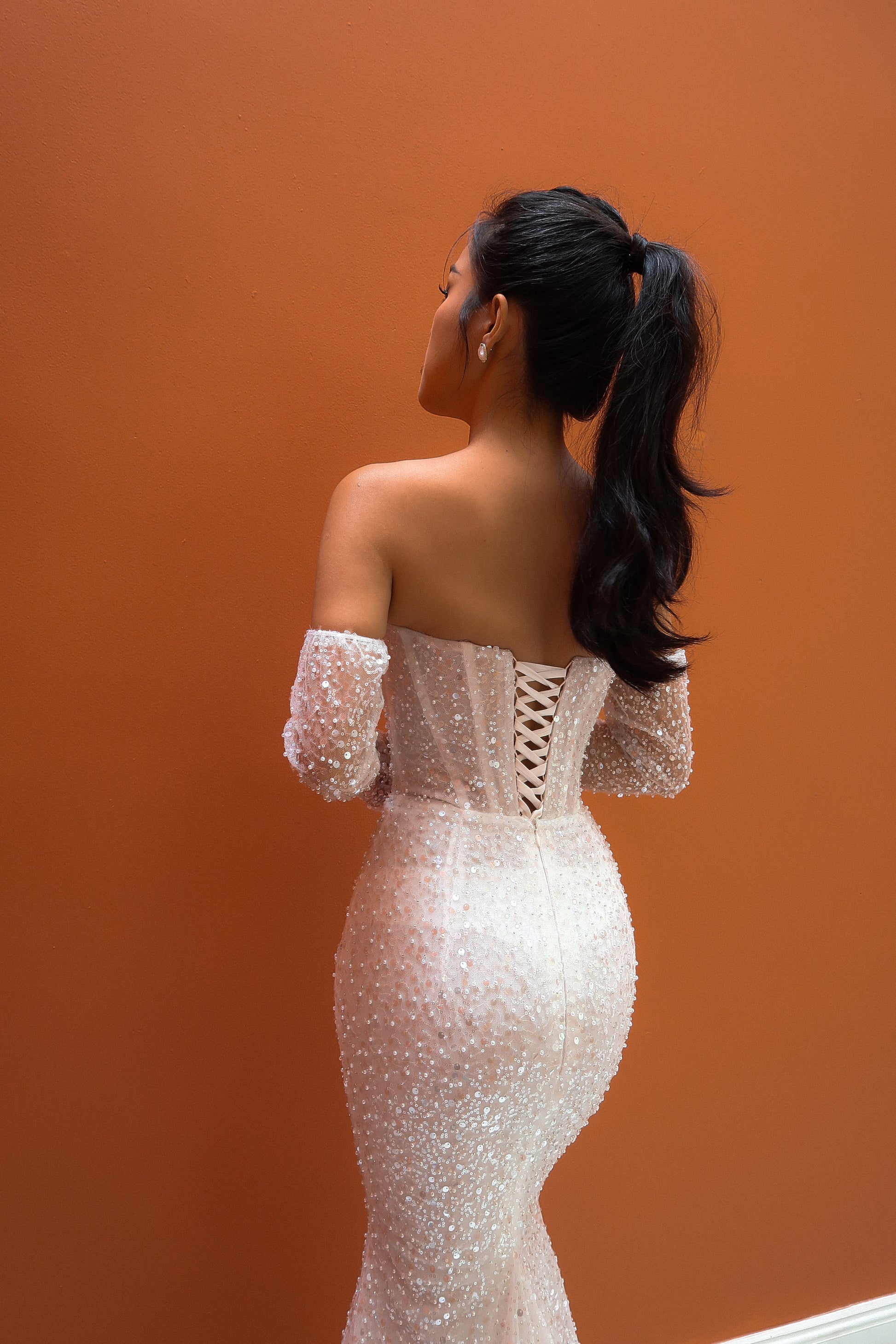 Command attention in the sparkle Ora wedding gown, a flattering fit-and-flare silhouette crafted from luxurious sequin and pearl beading. Featuring a sweetheart neckline structured bodice, this gown offers versatile styling options with detachable sleeves—between elegant off-the-shoulder or fitted long sleeves. The dramatic court train with horsehair trim creates a stunning wavy effect that enhances your every movement. A corset lace fastening at the back ensures a flexible fit.