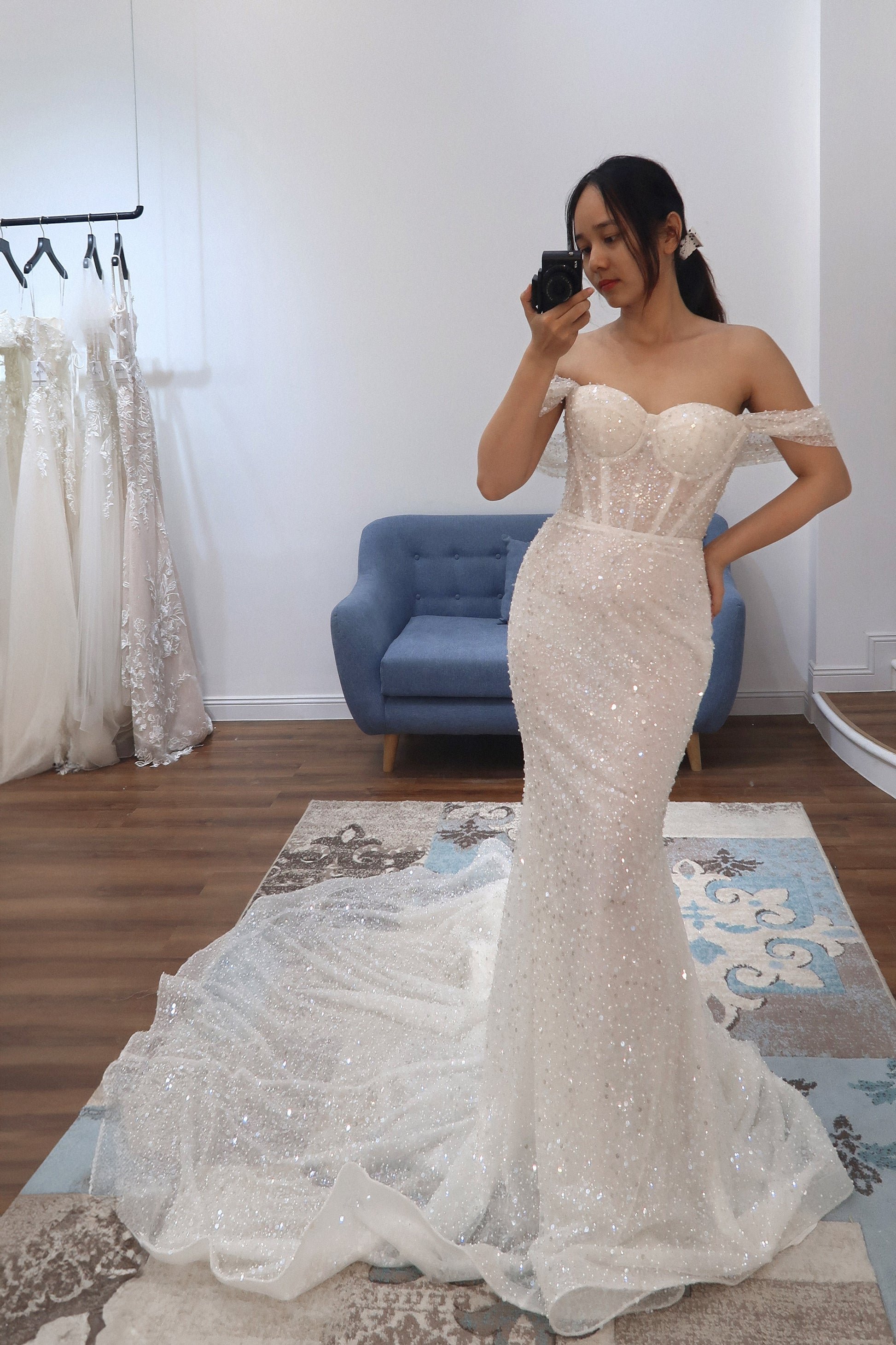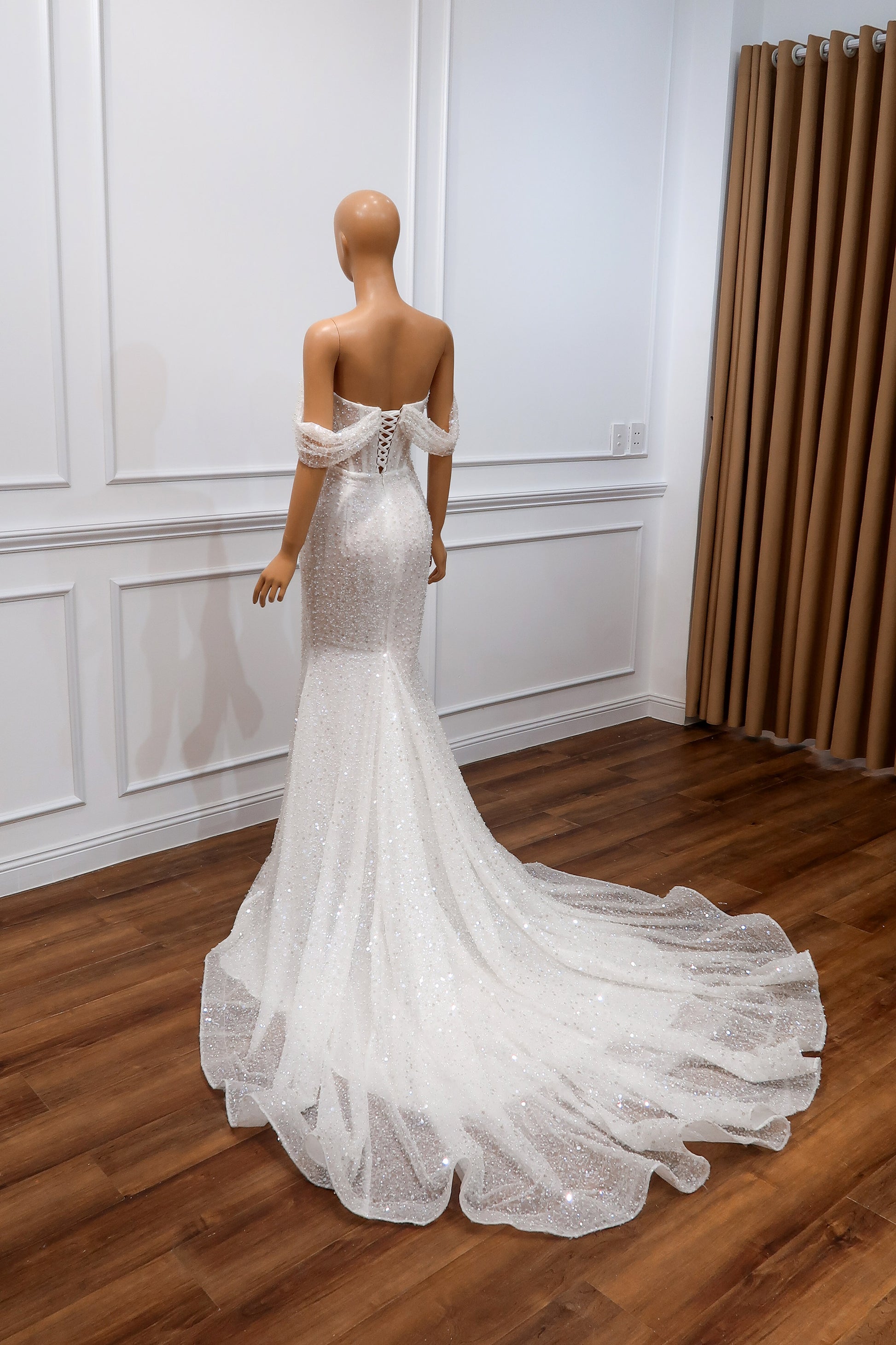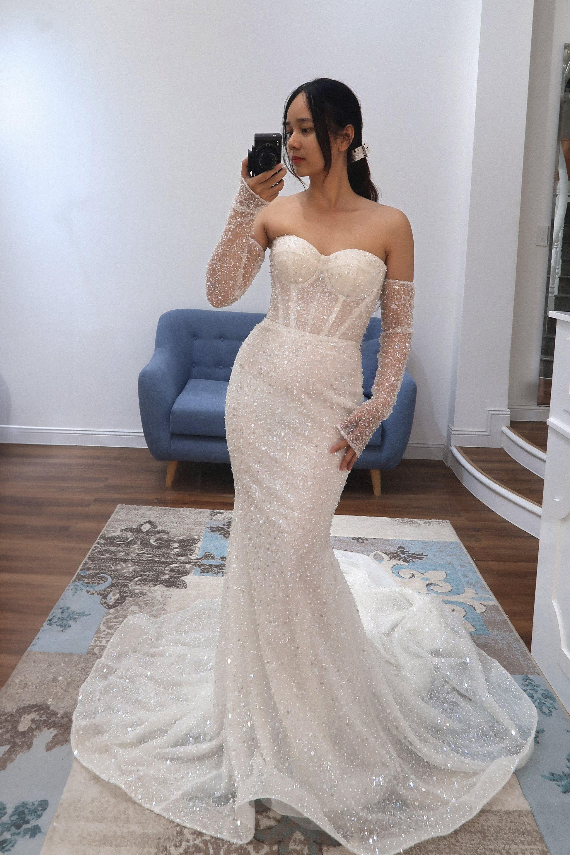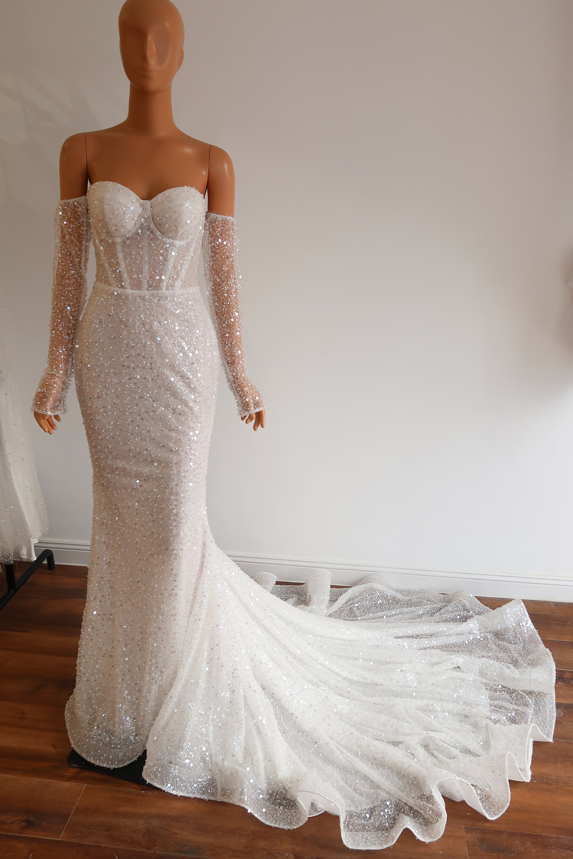 Command attention in the sparkle Ora wedding gown, a flattering fit-and-flare silhouette crafted from luxurious sequin and pearl beading. Featuring a sweetheart neckline structured bodice, this gown offers versatile styling options with detachable sleeves—between elegant off-the-shoulder or fitted long sleeves. The dramatic court train with horsehair trim creates a stunning wavy effect that enhances your every movement. A corset lace fastening at the back ensures a flexible fit.
