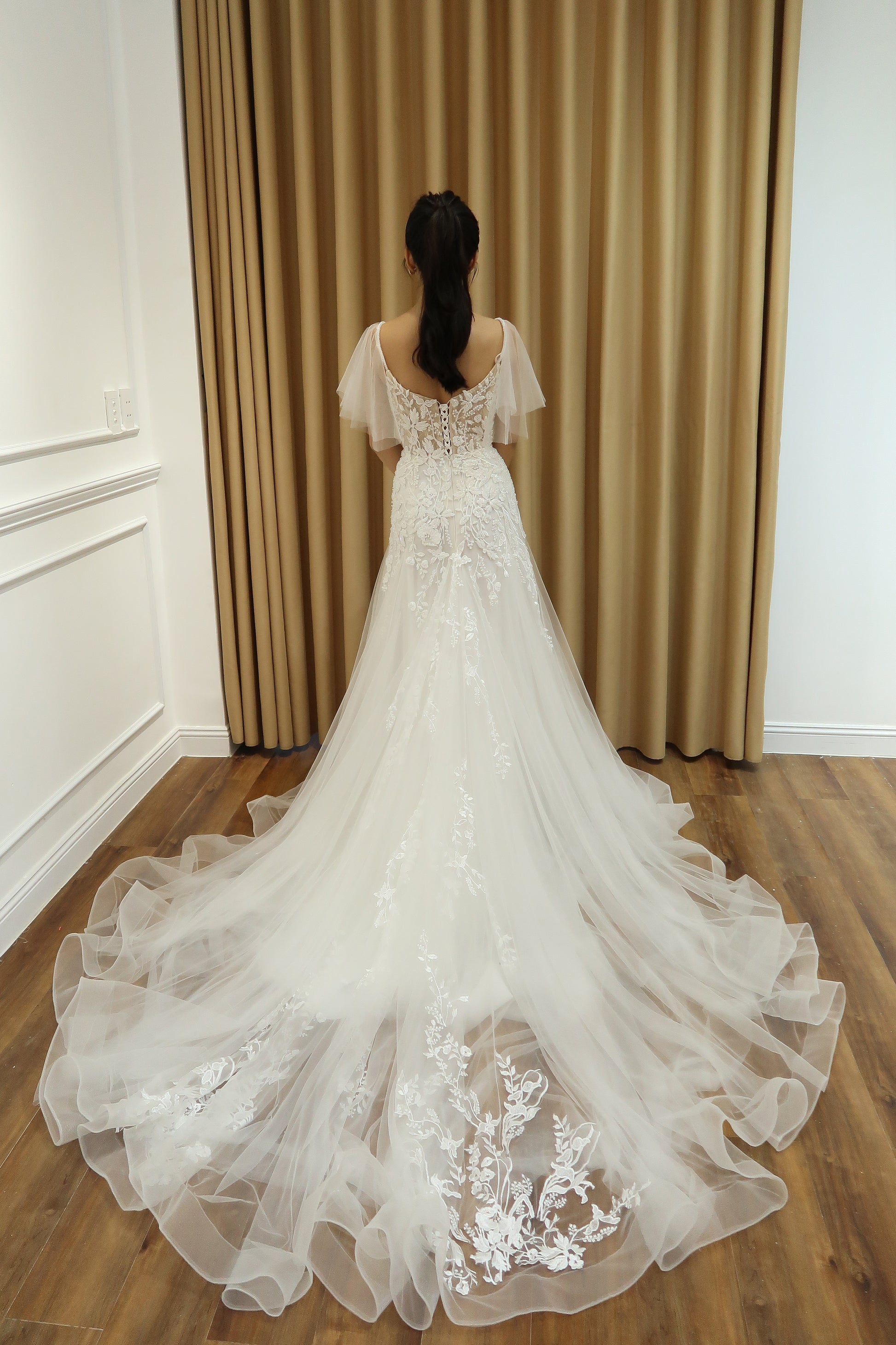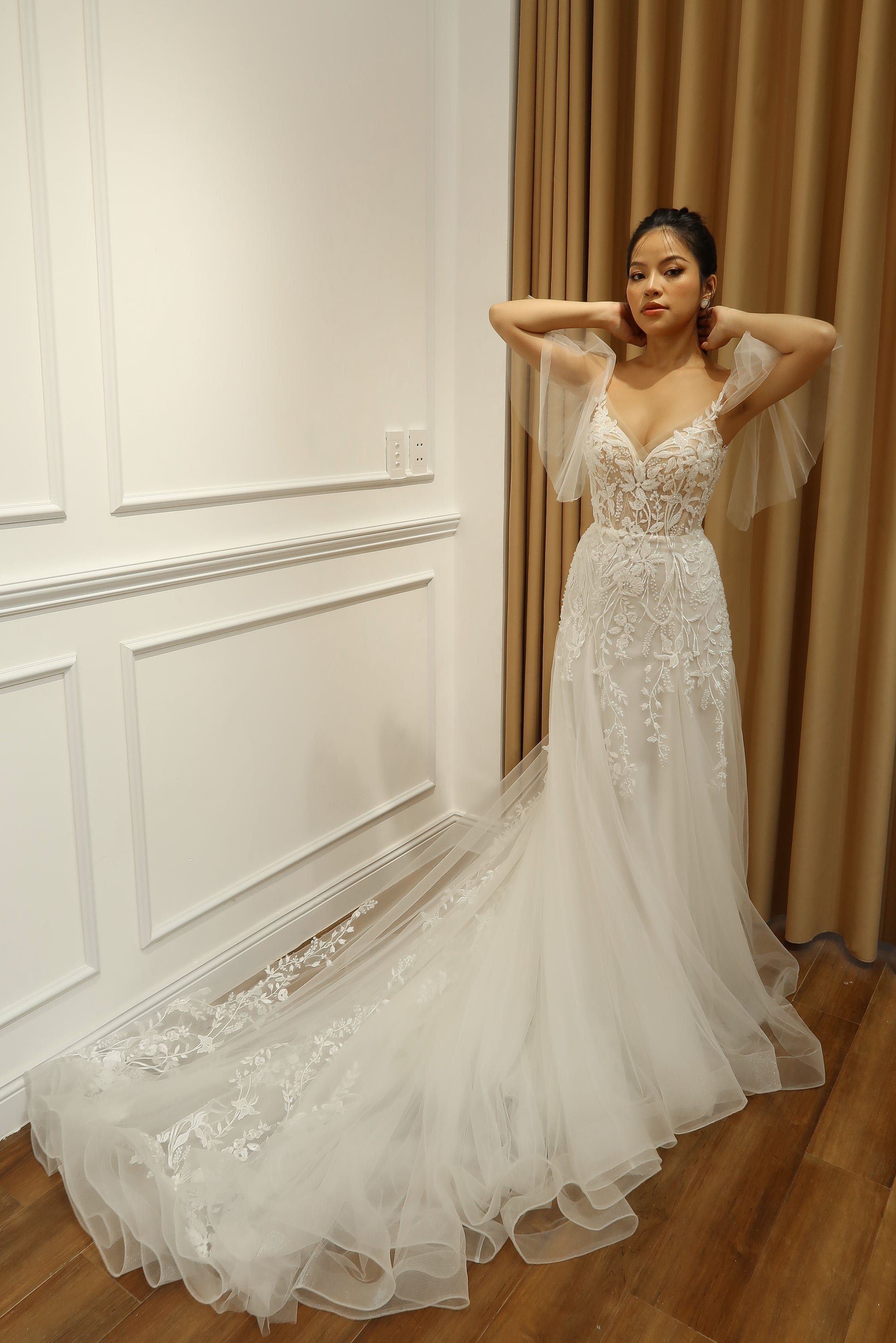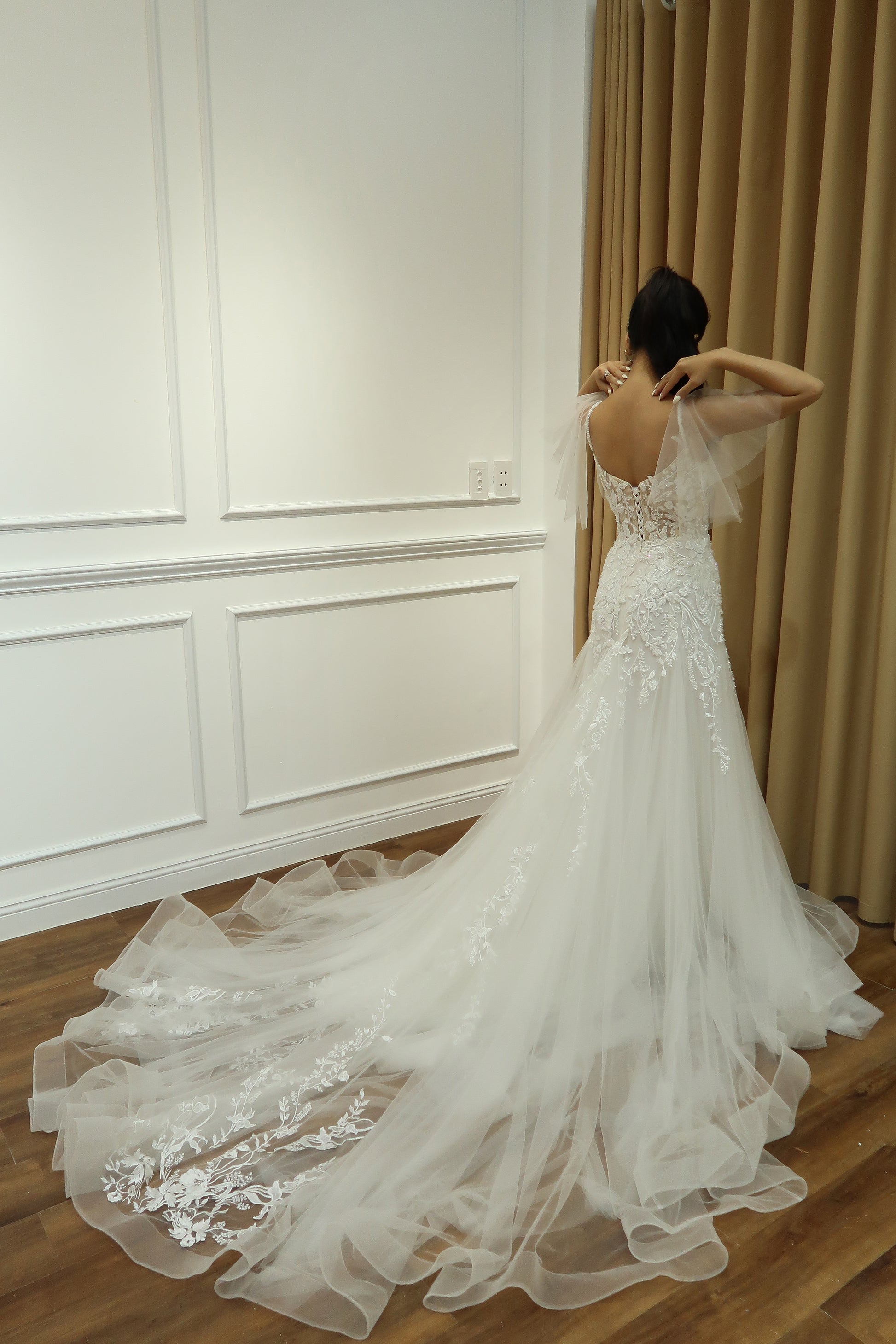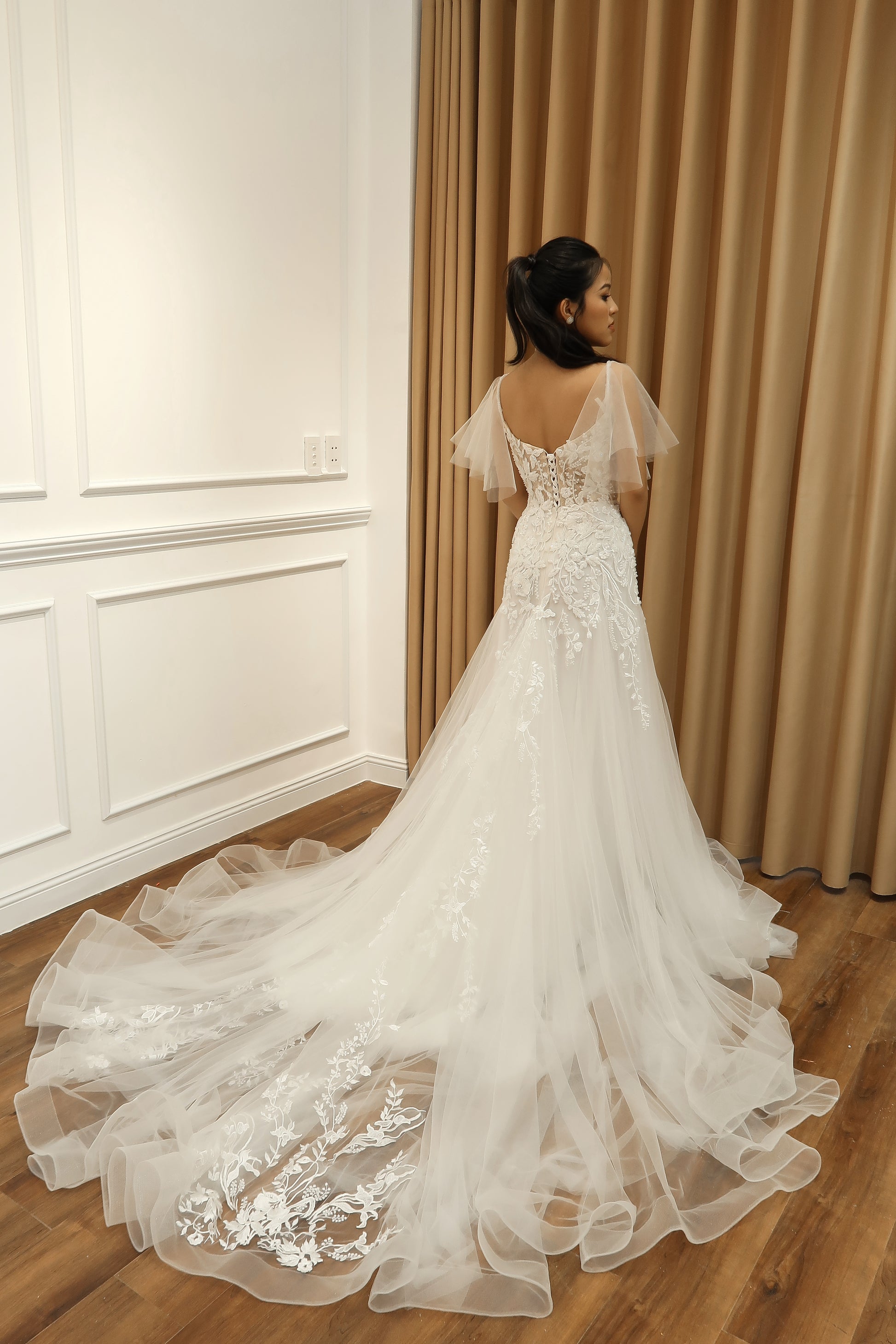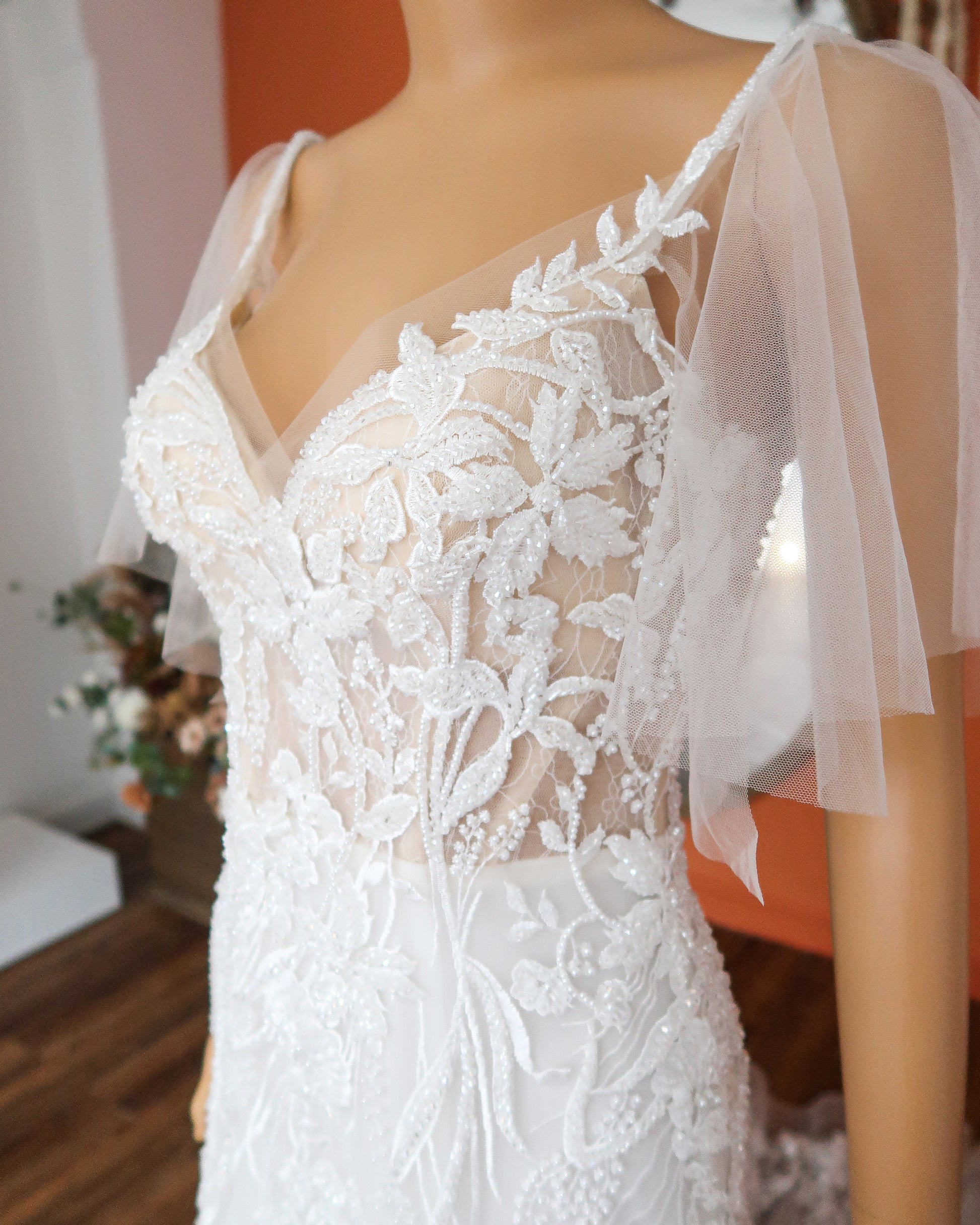 - Hidden boning bodice with V-neckline and built-in pads for extra support.