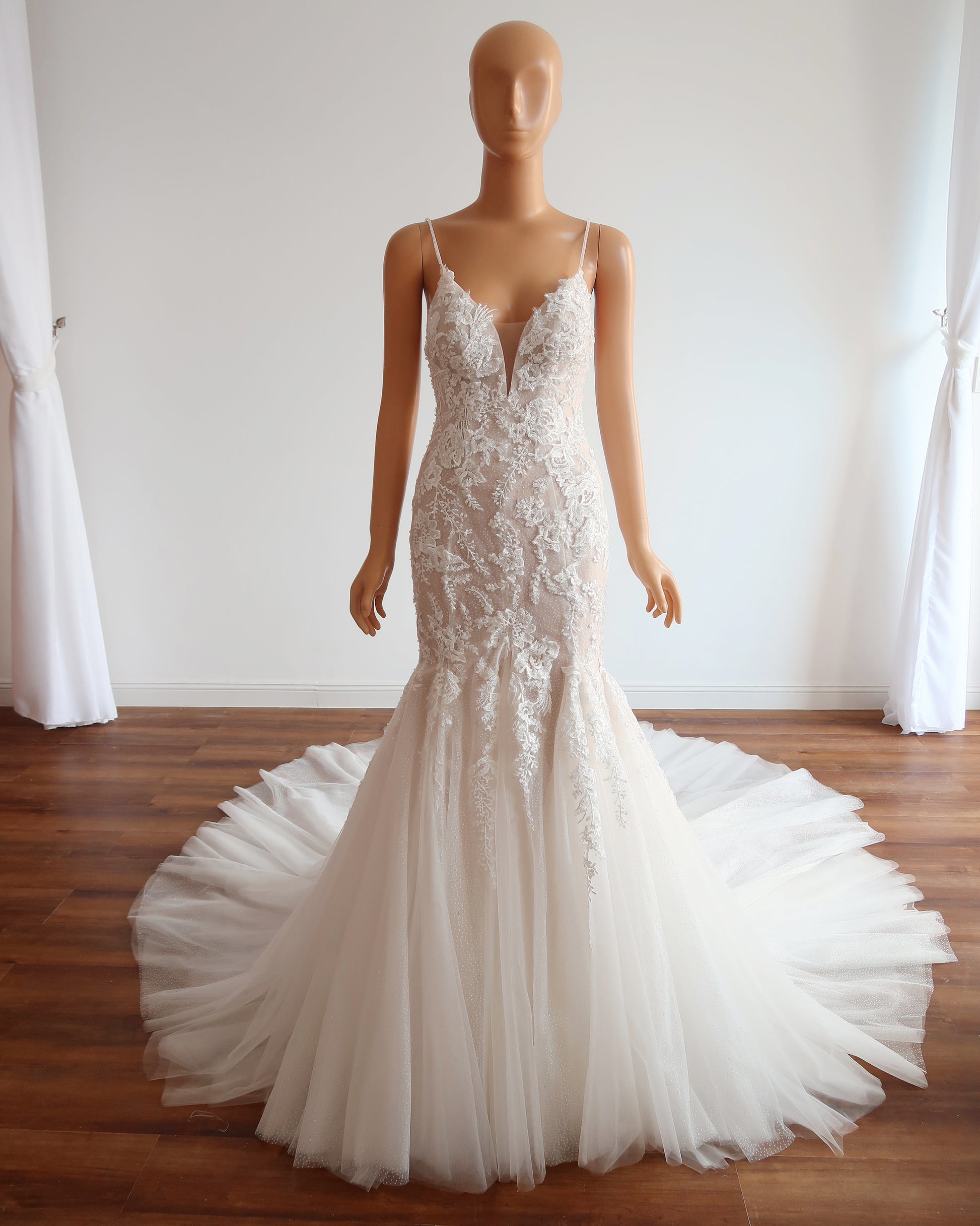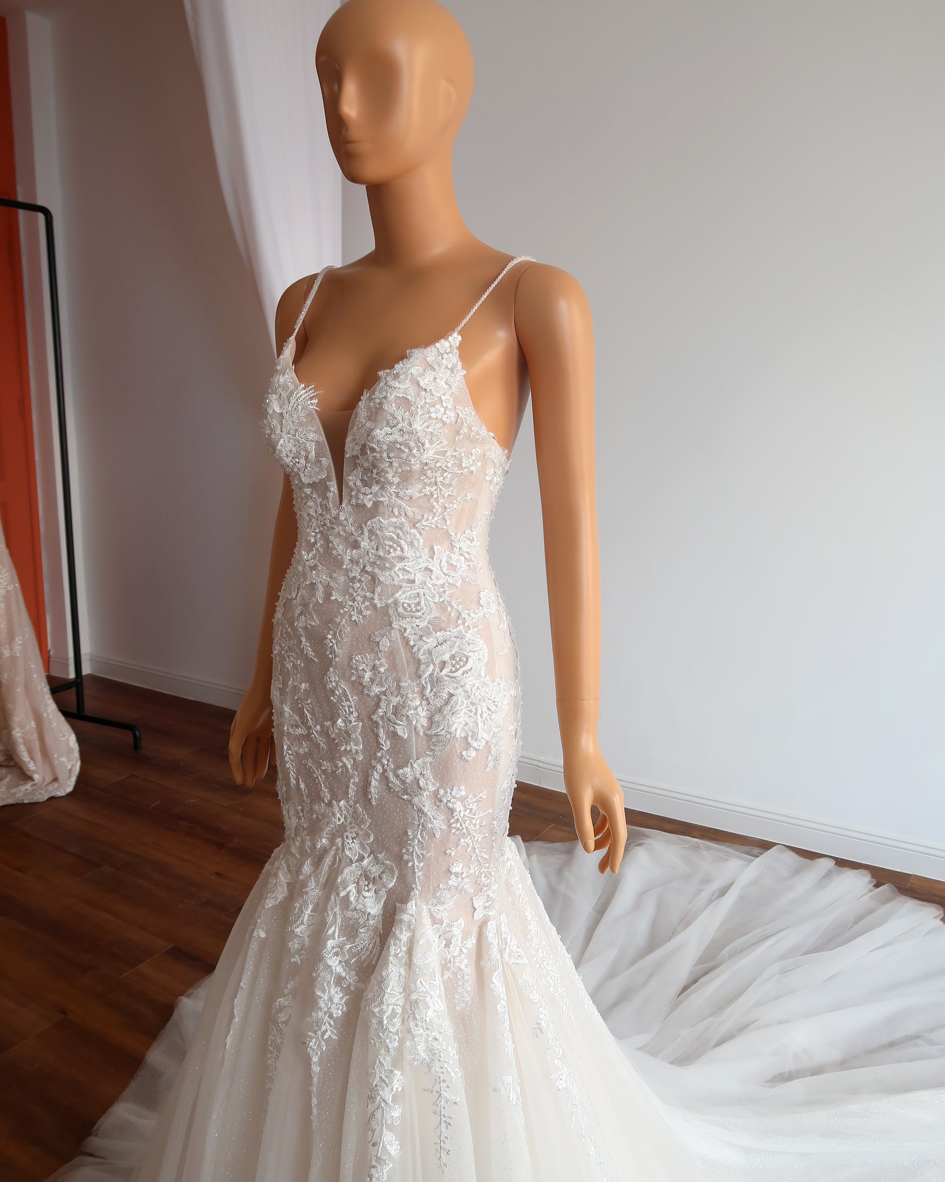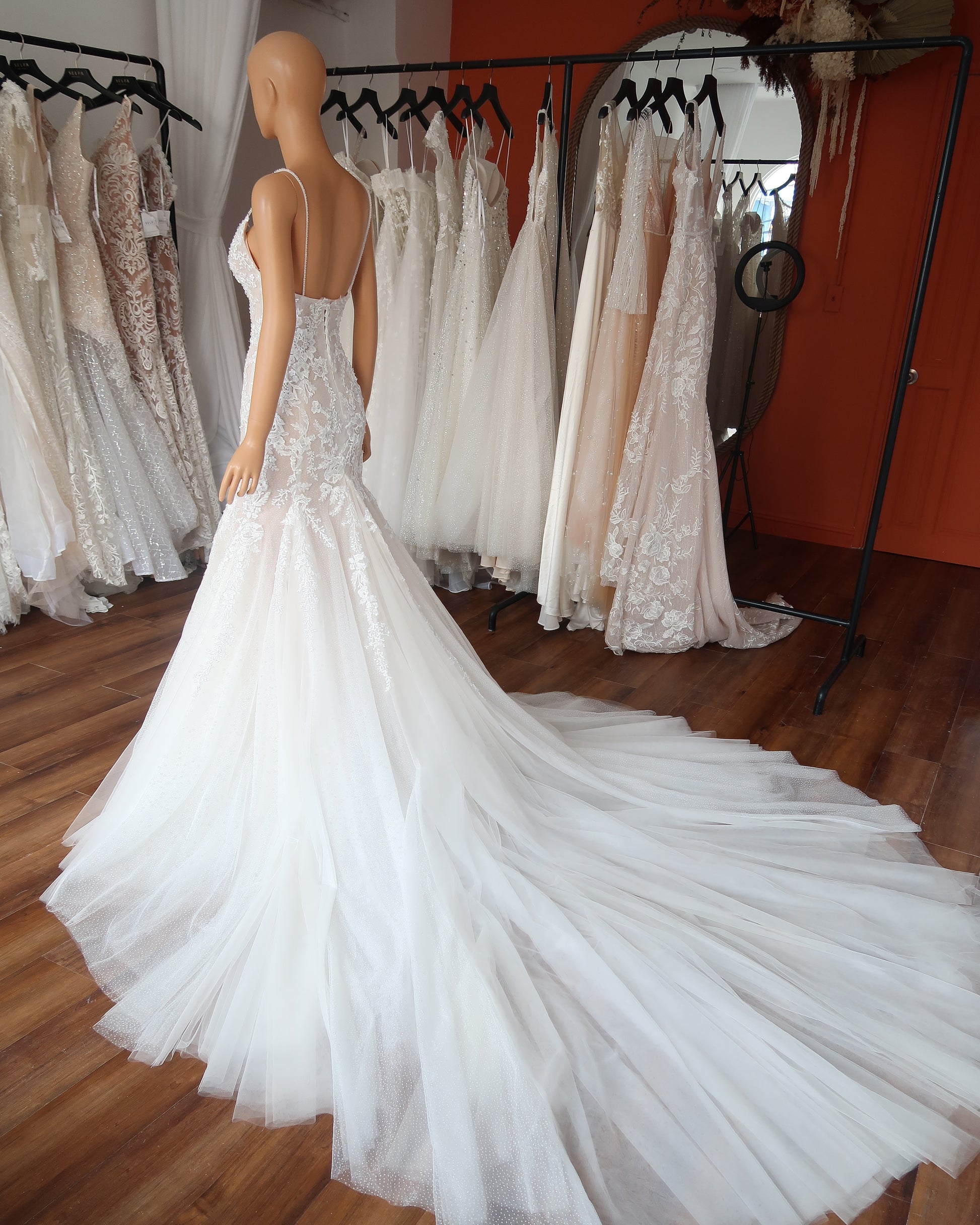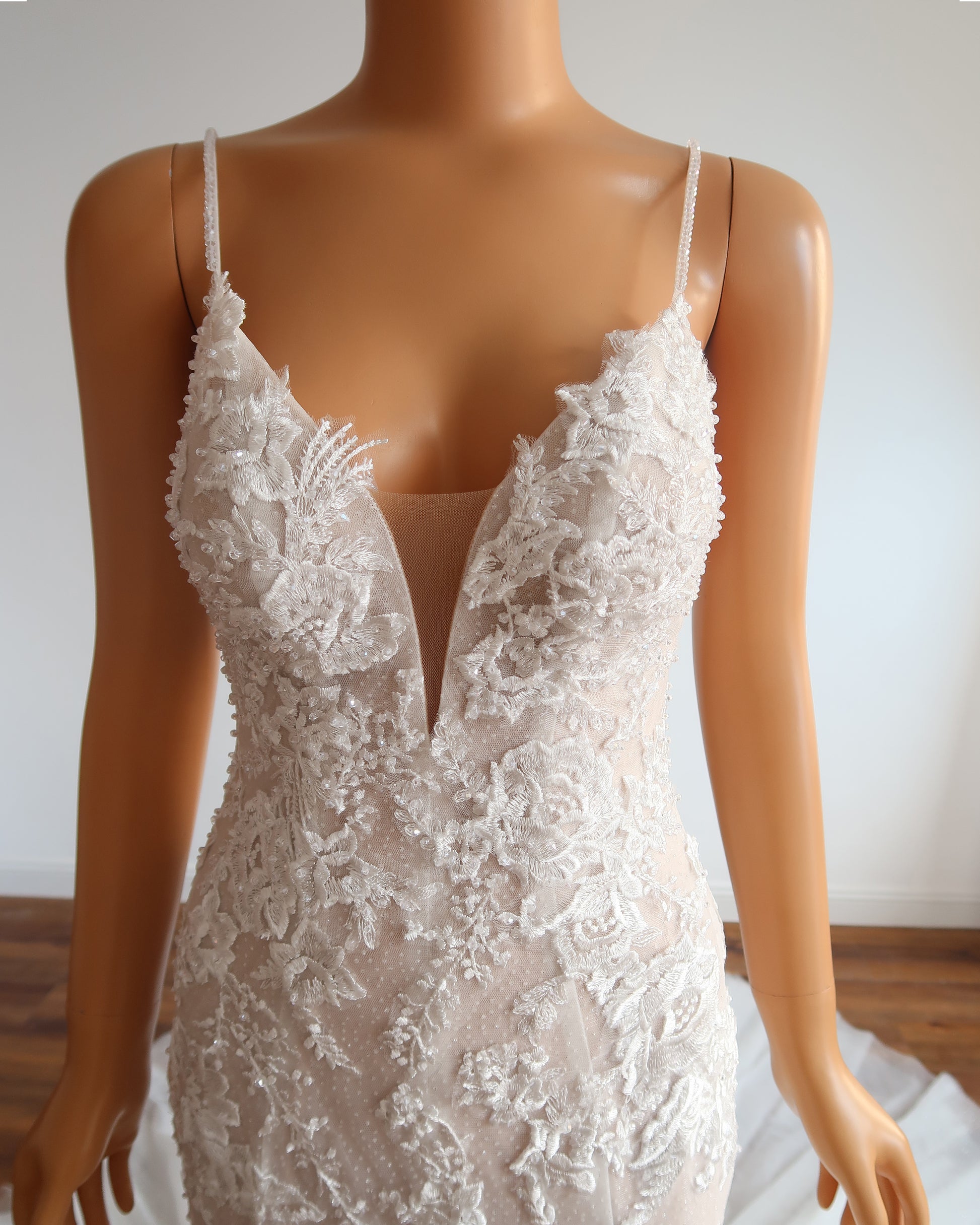 This flawless wedding dress combination of a stunning crystal beaded bodice with a deep curvy V-neck, spaghetti straps, and a mermaid tulle skirt is all you need for a summer wedding.