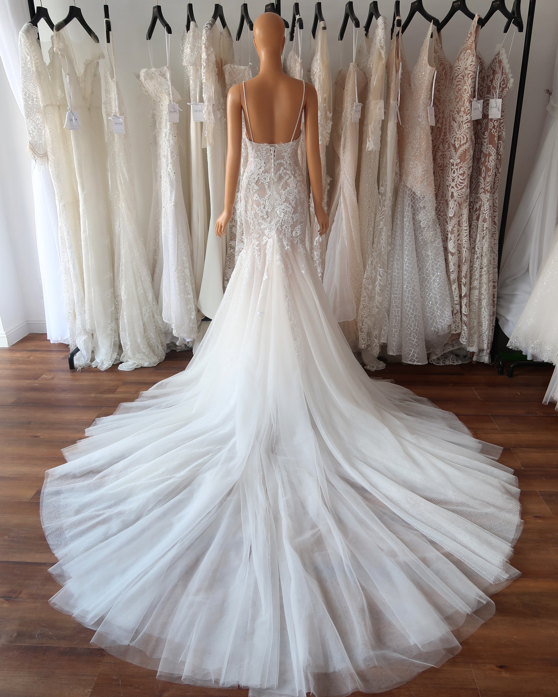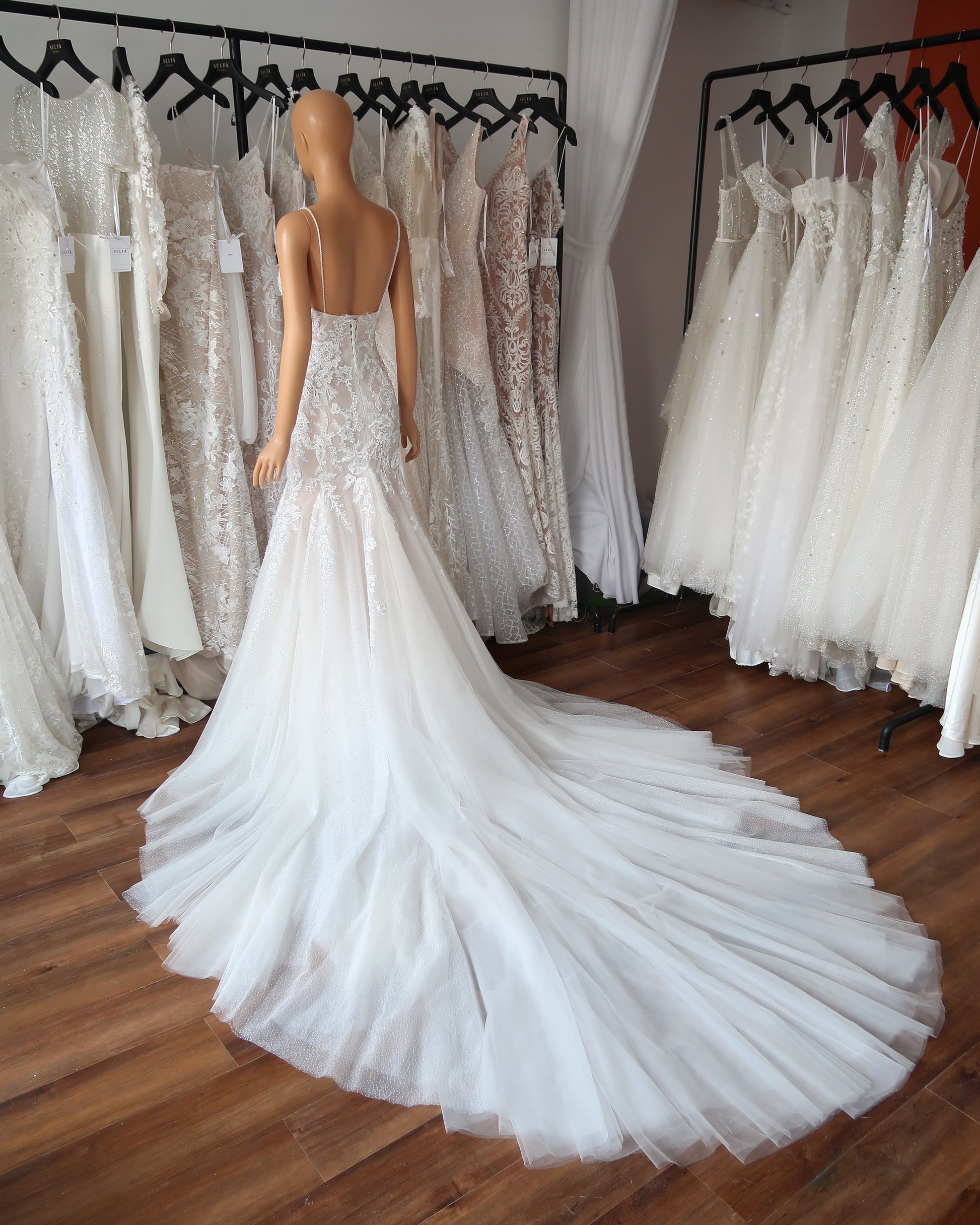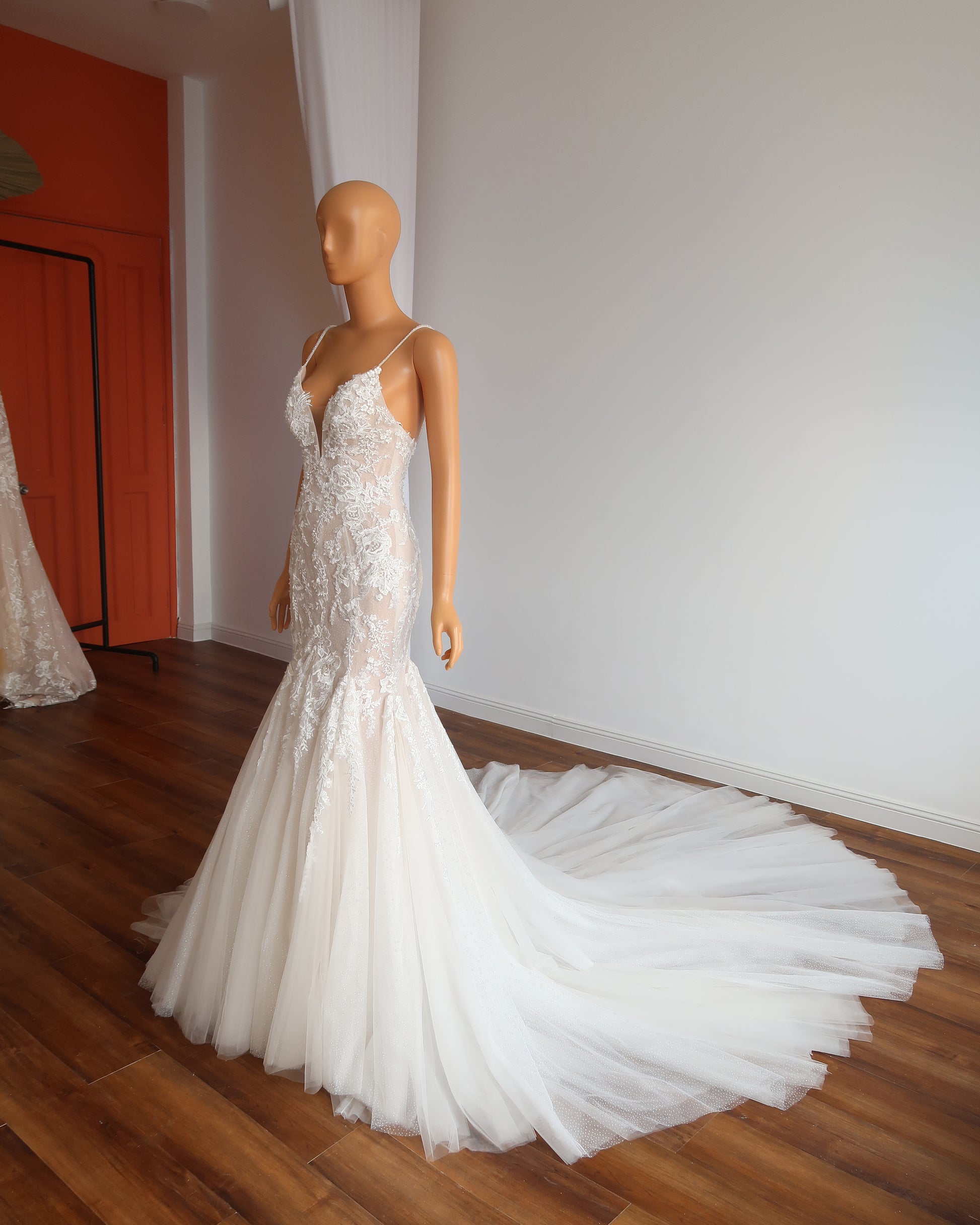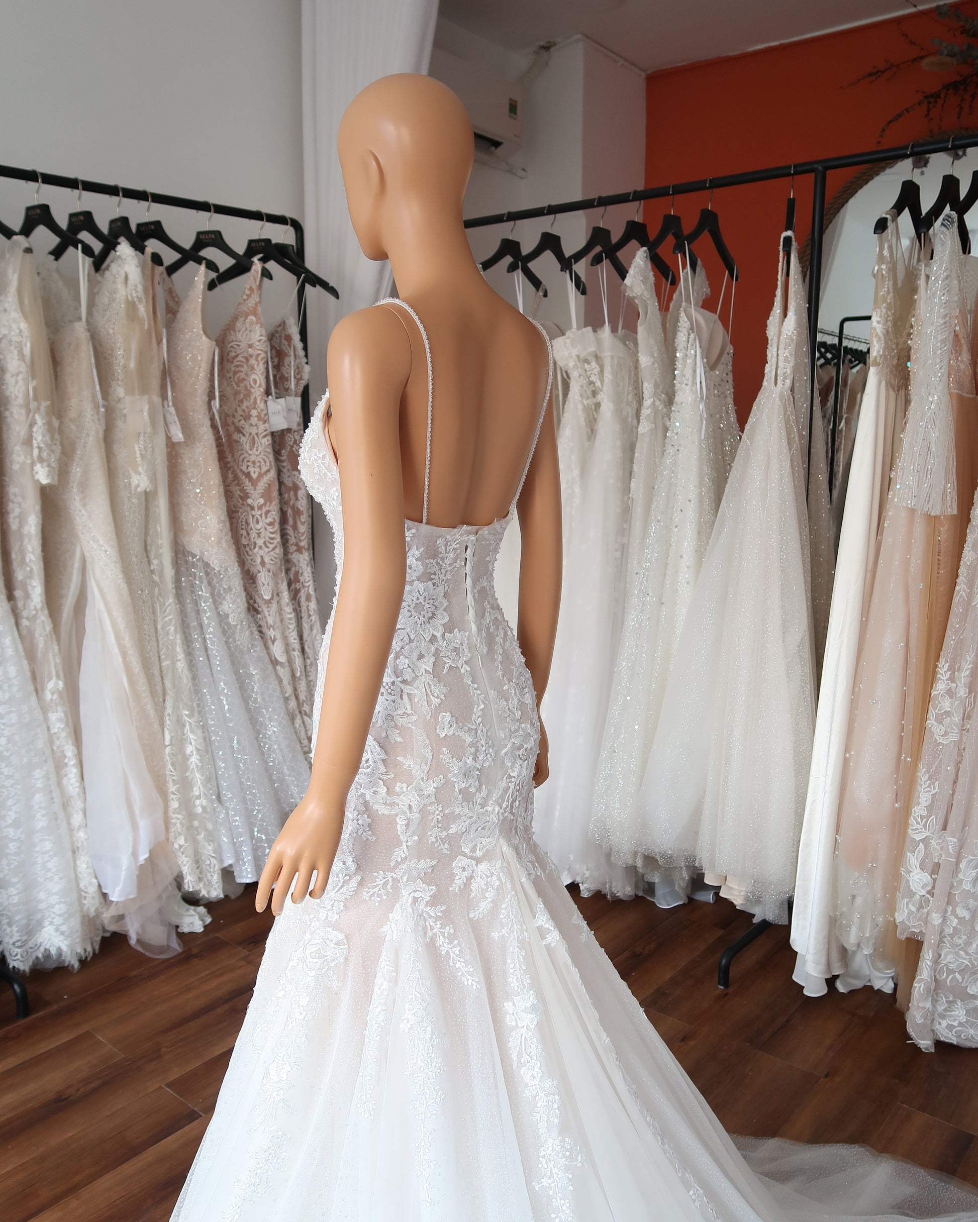 This flawless wedding dress combination of a stunning crystal beaded bodice with a deep curvy V-neck, spaghetti straps, and a mermaid tulle skirt is all you need for a summer wedding.