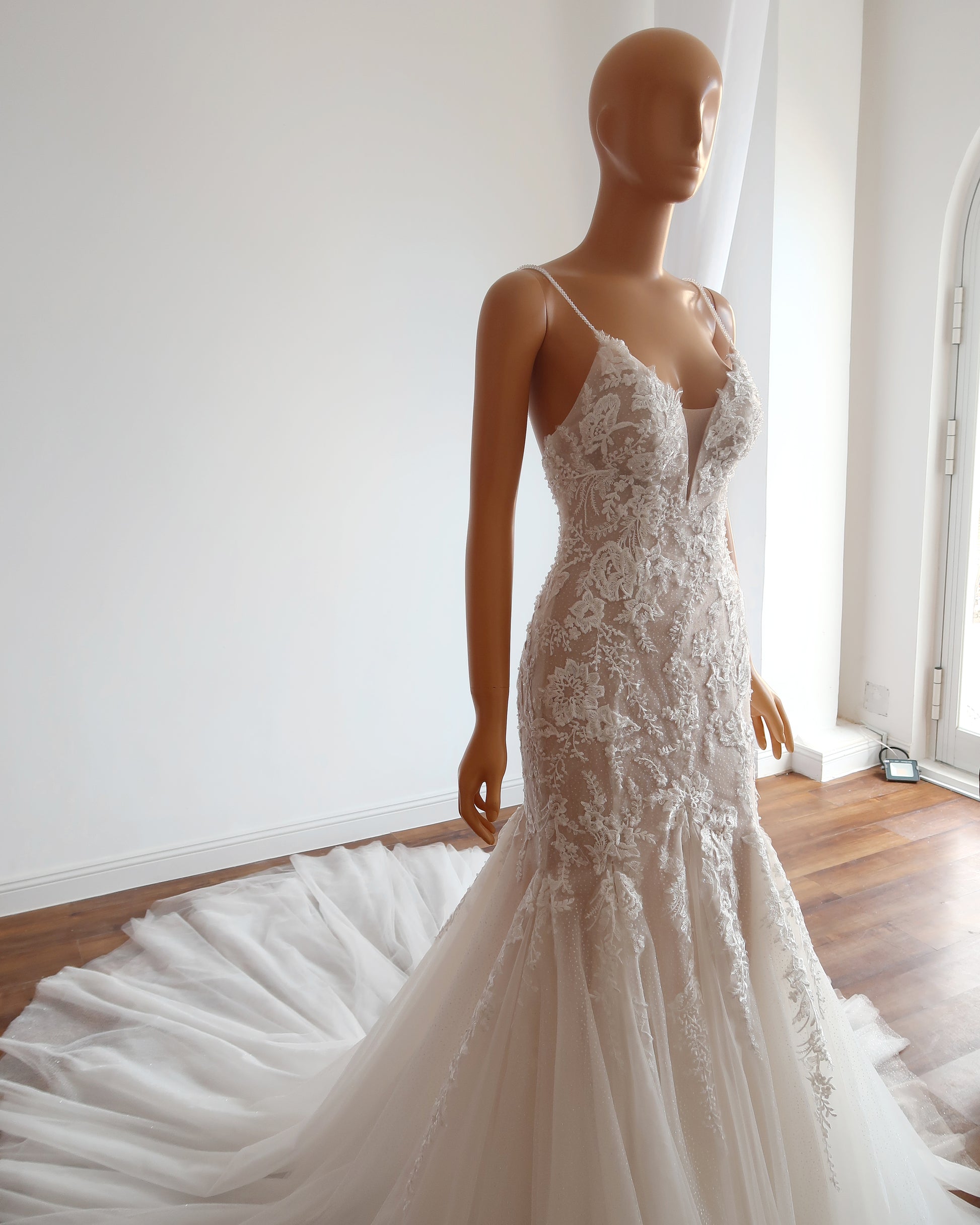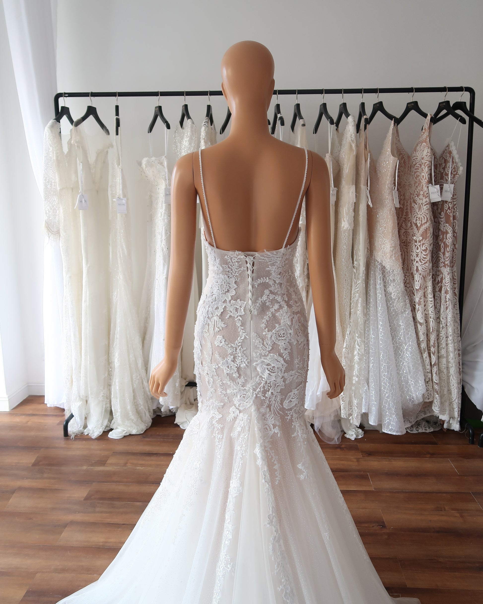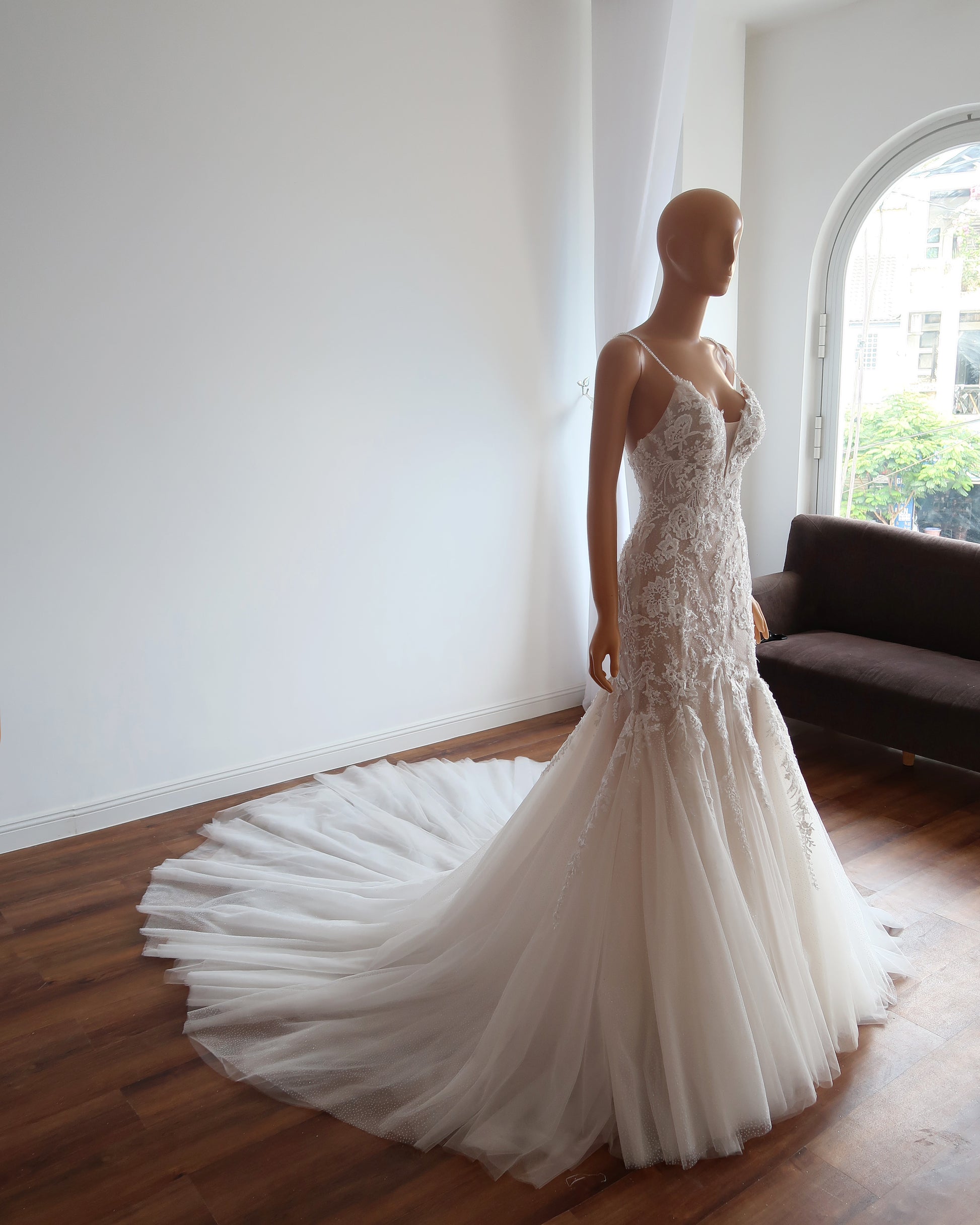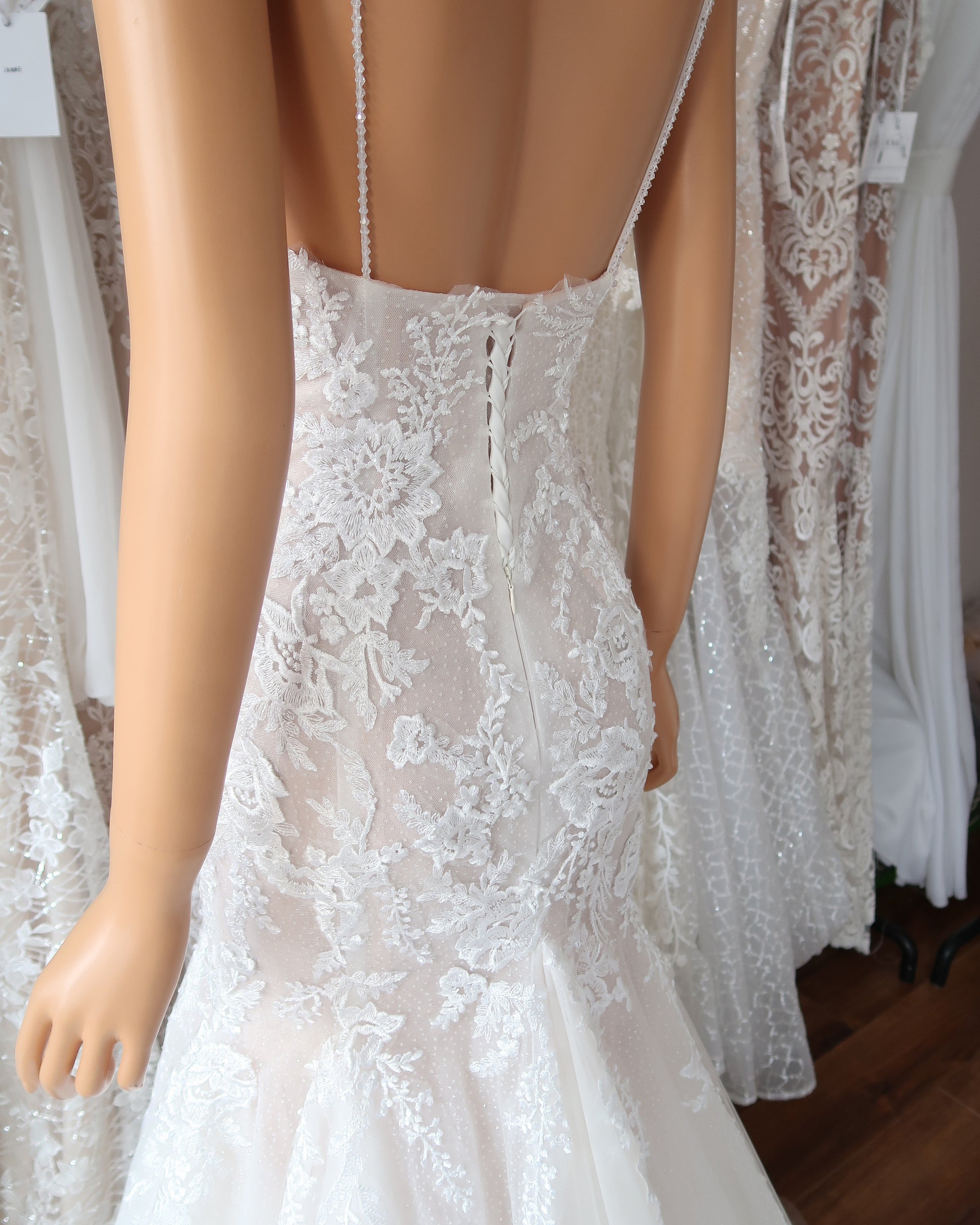This flawless wedding dress combination of a stunning crystal beaded bodice with a deep curvy V-neck, spaghetti straps, and a mermaid tulle skirt is all you need for a summer wedding.