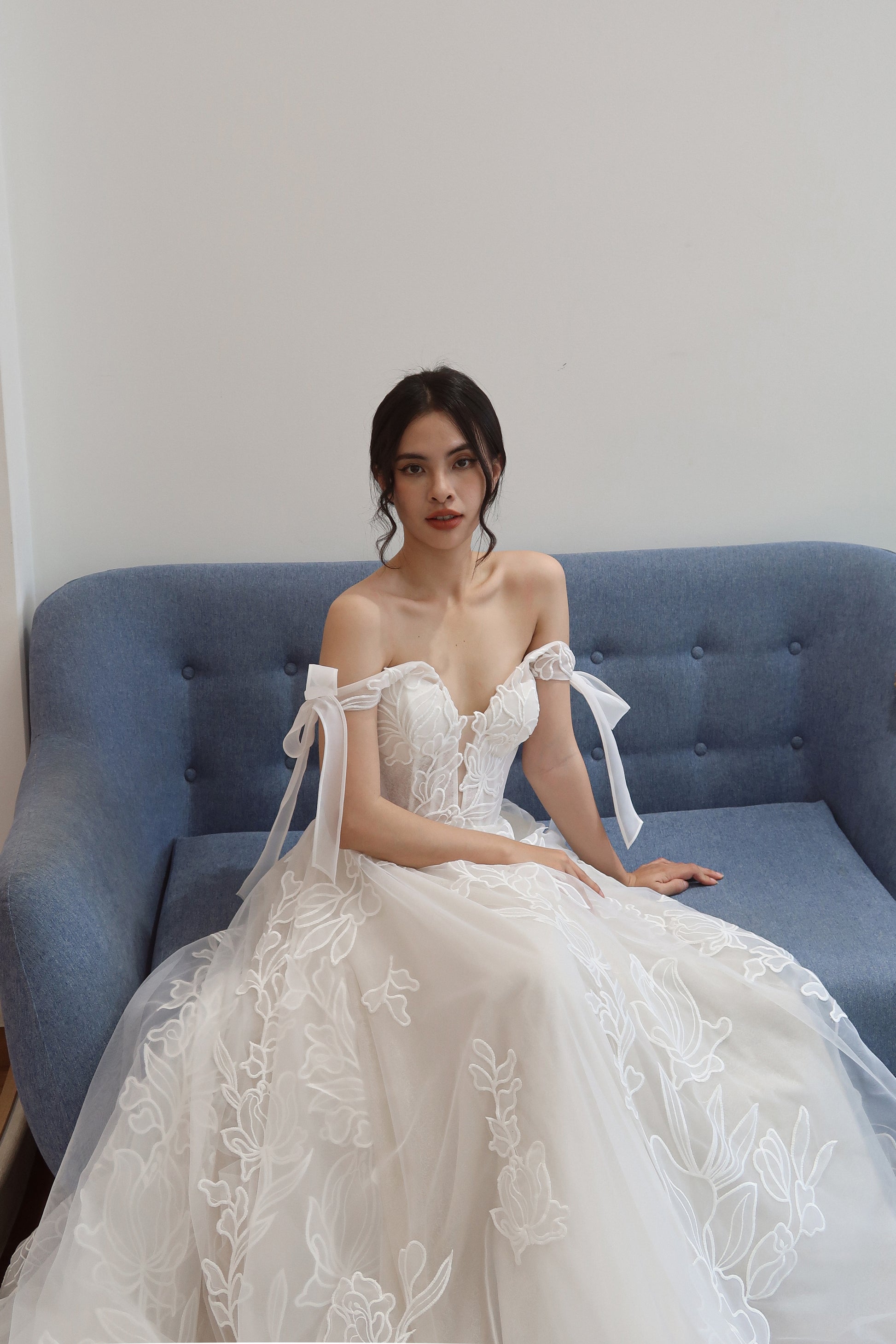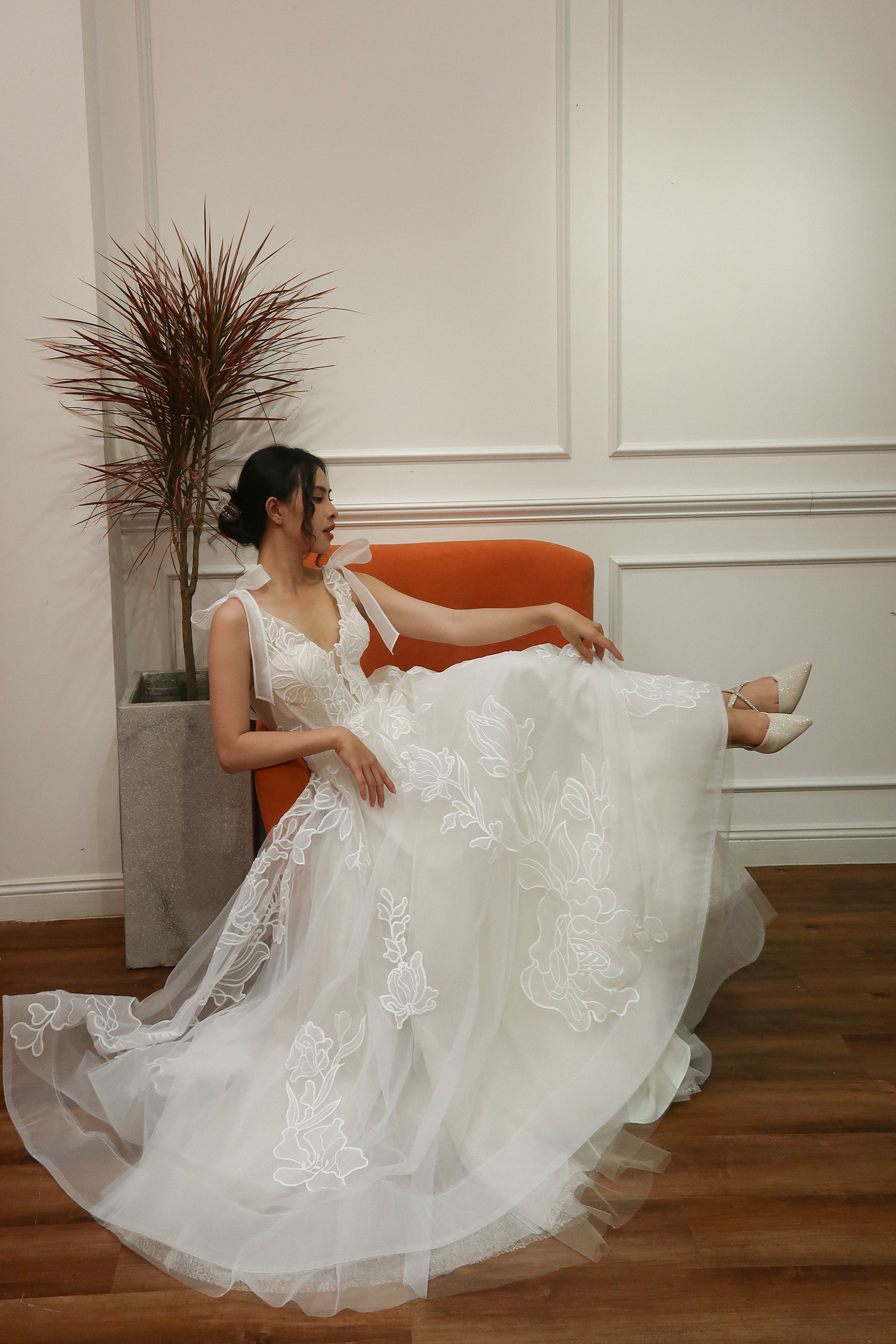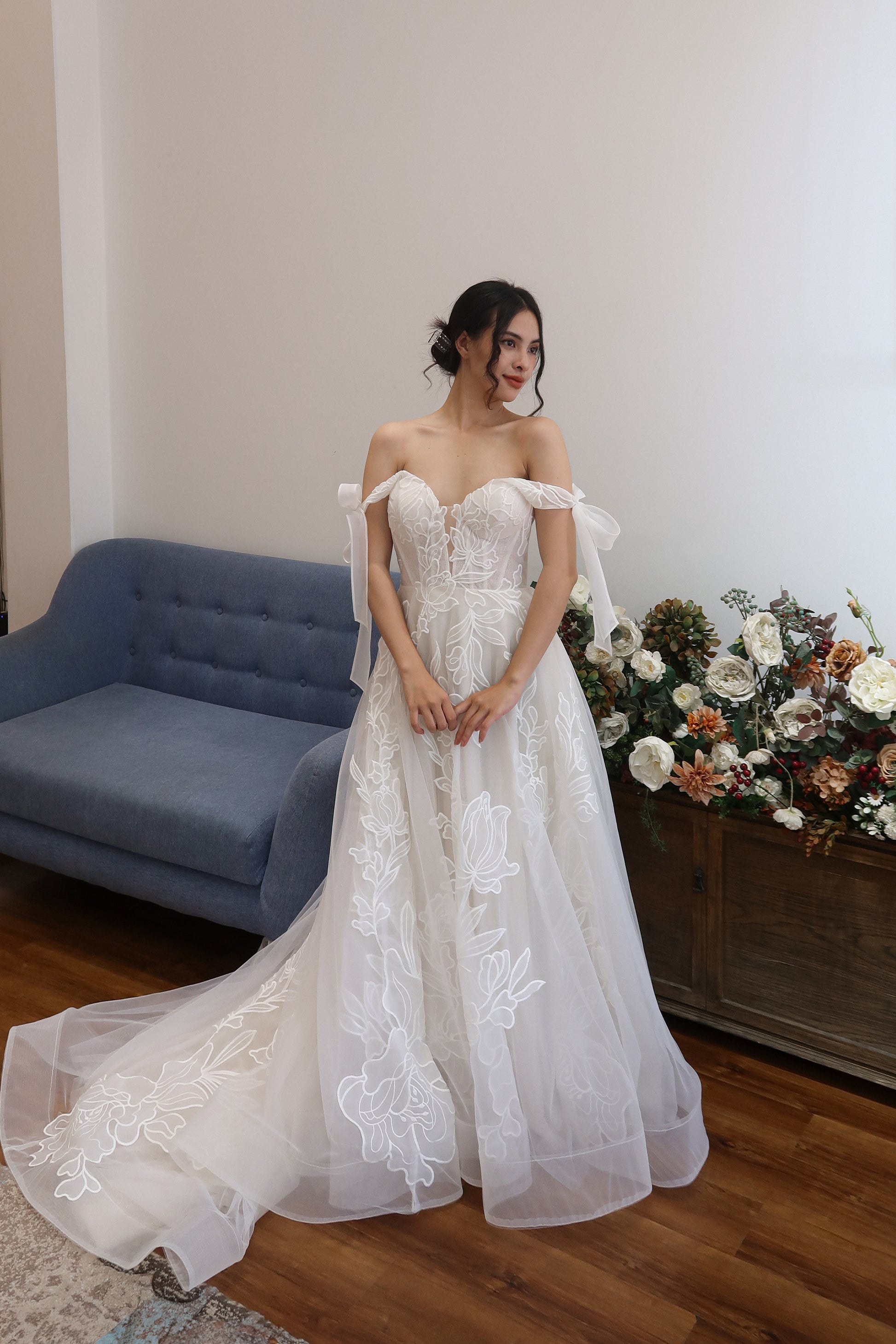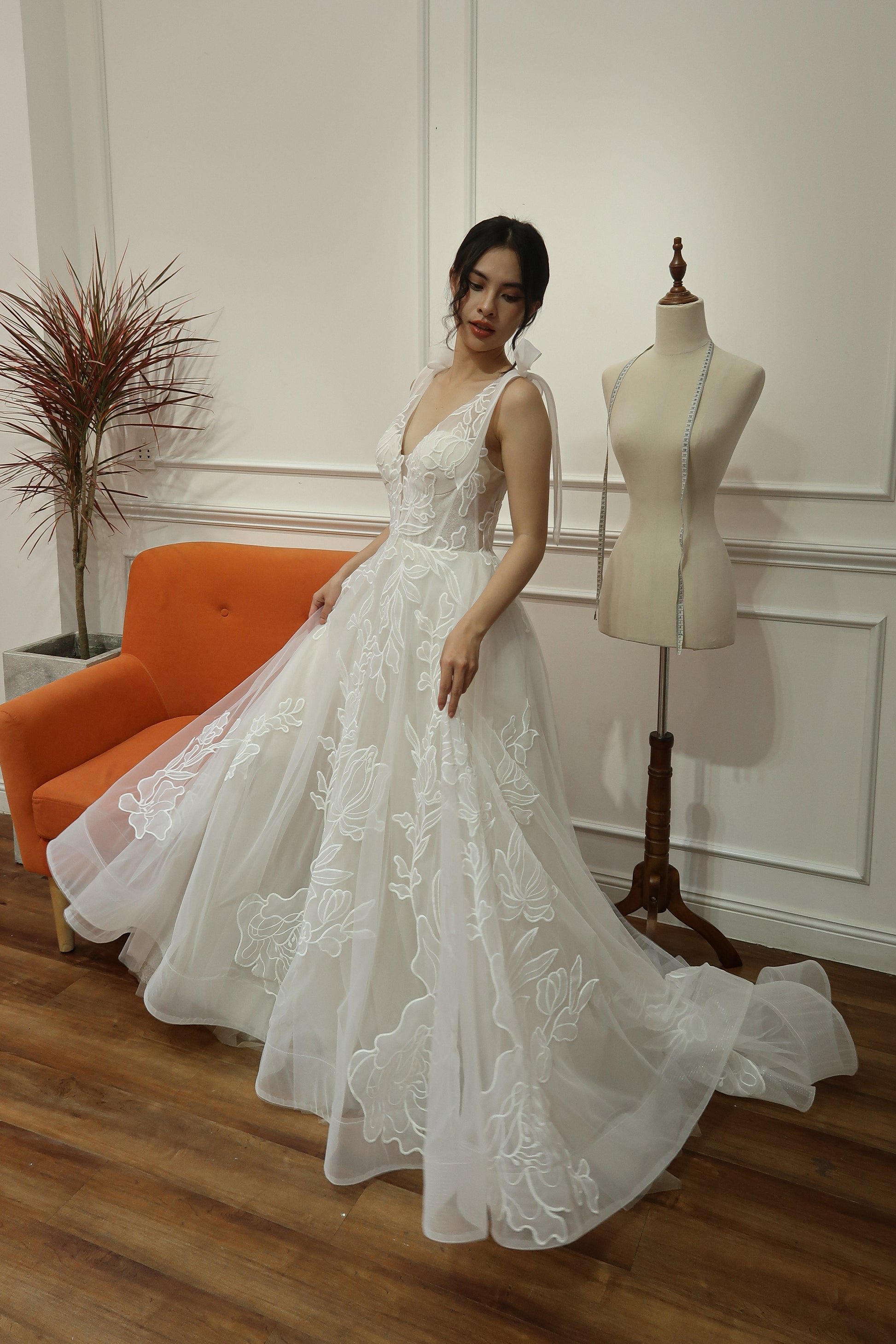 This romantic bridal gown features a plunging V neckline, subtle sparkle netting, and organza laser cut embroidered lace with a large floral pattern. The dress includes versatile bow straps that can be worn on or off the shoulder, and a corset boning bodice for support. Flowing and airy, it’s ideal for outdoor and garden weddings.