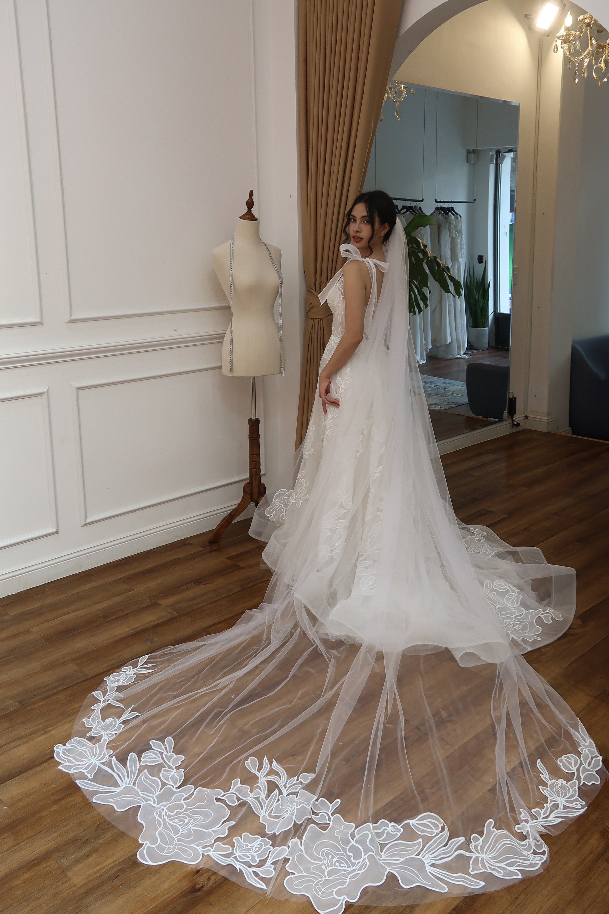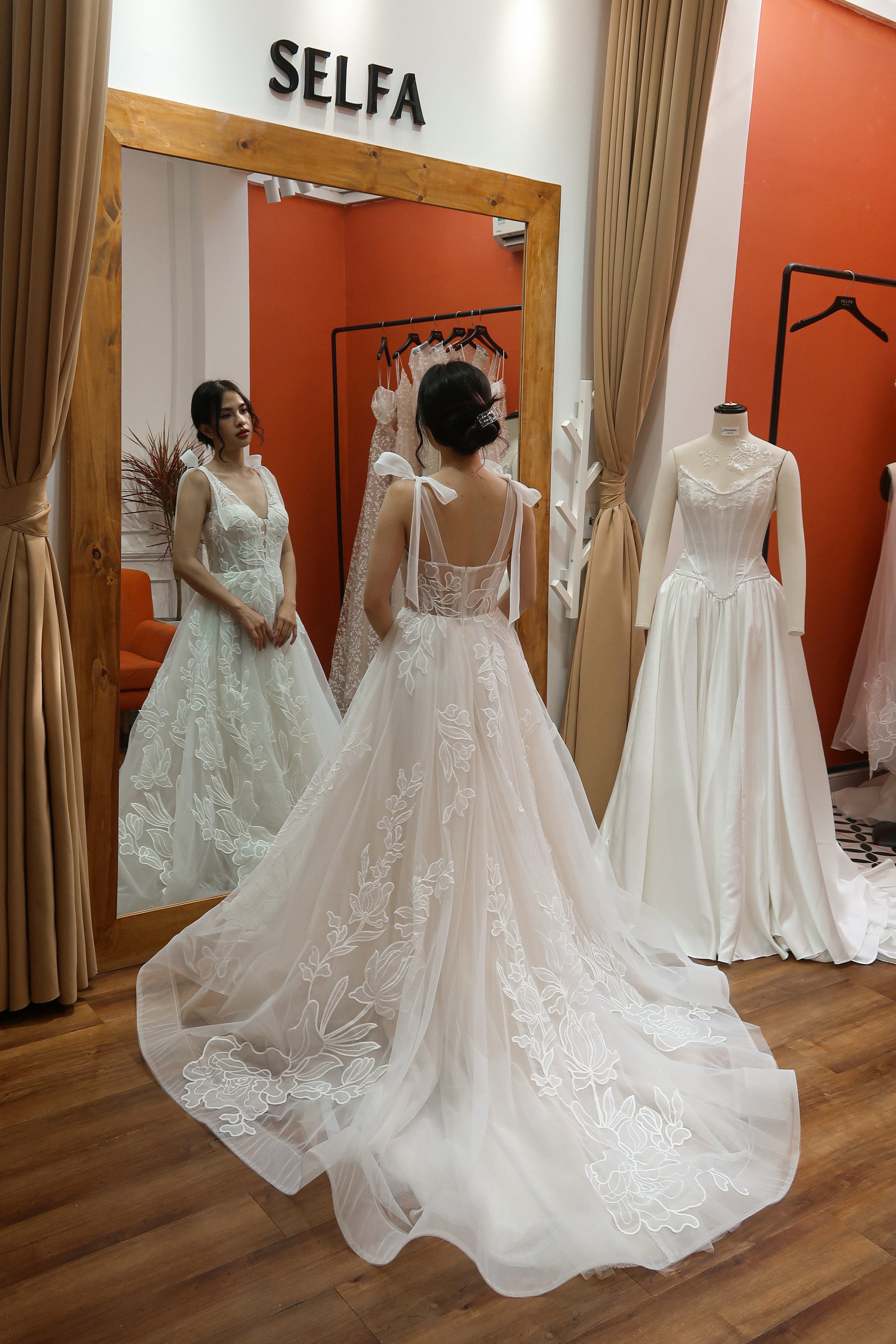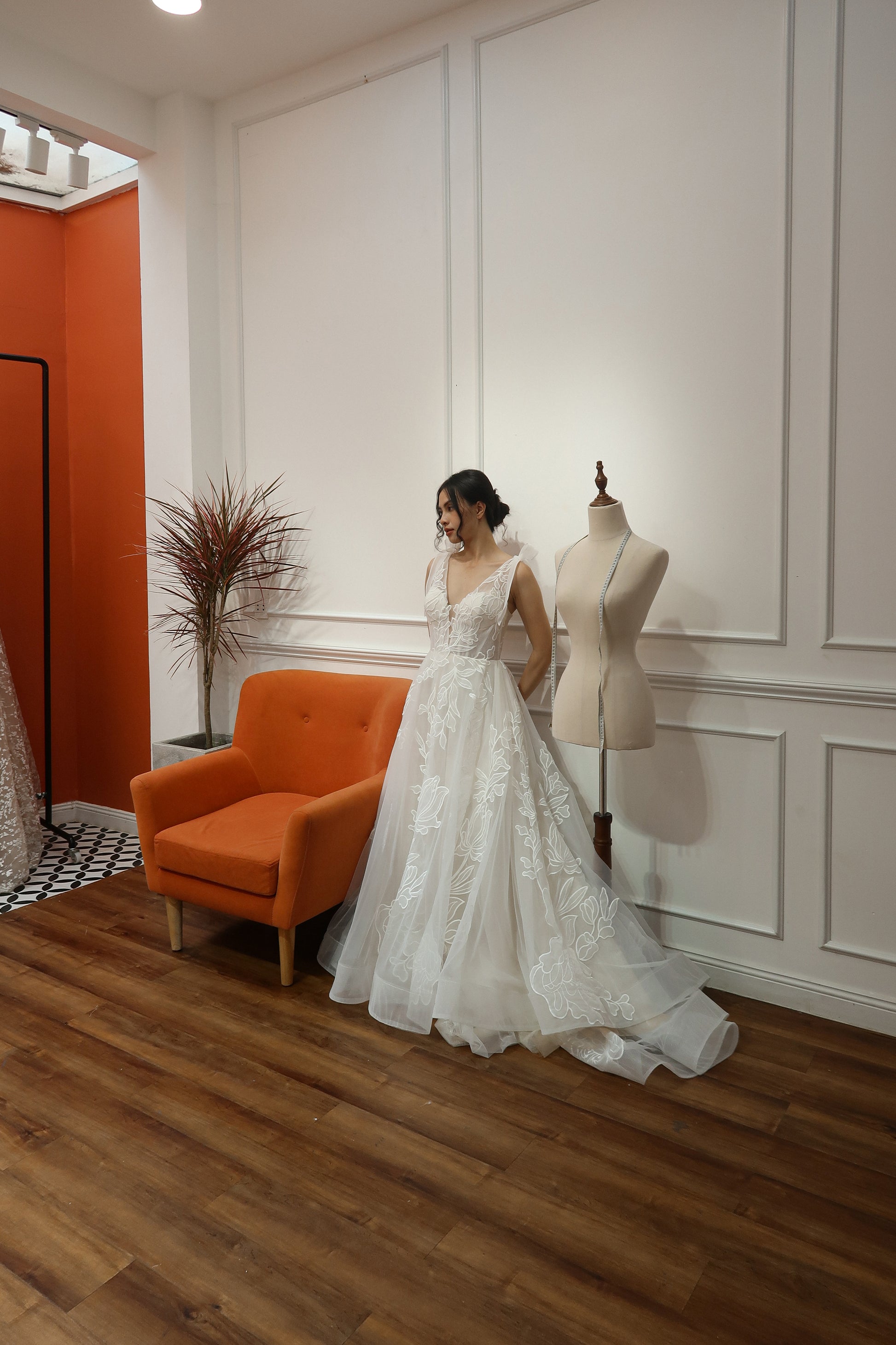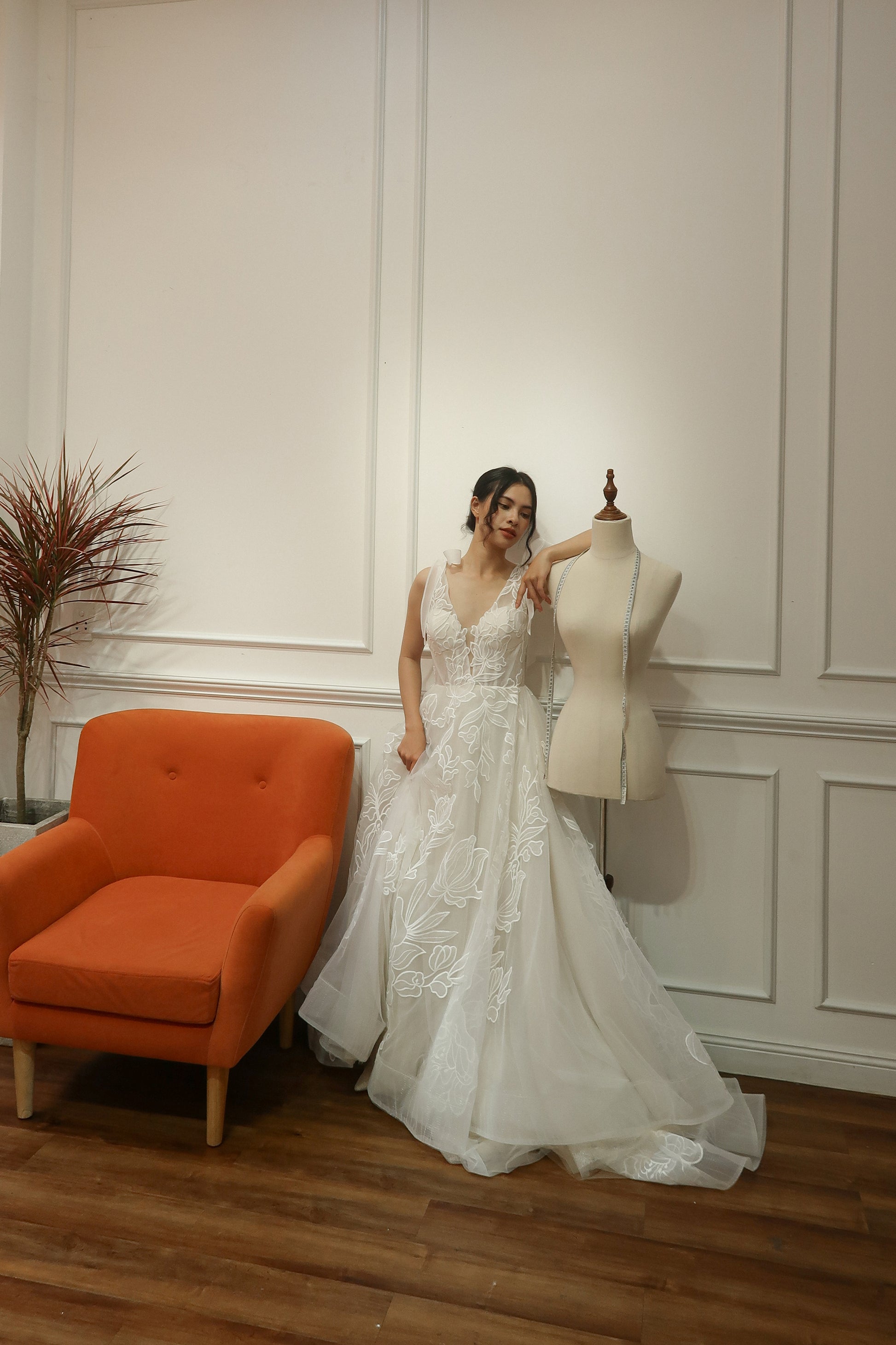 This romantic bridal gown features a plunging V neckline, subtle sparkle netting, and organza laser cut embroidered lace with a large floral pattern. The dress includes versatile bow straps that can be worn on or off the shoulder, and a corset boning bodice for support. Flowing and airy, it’s ideal for outdoor and garden weddings.