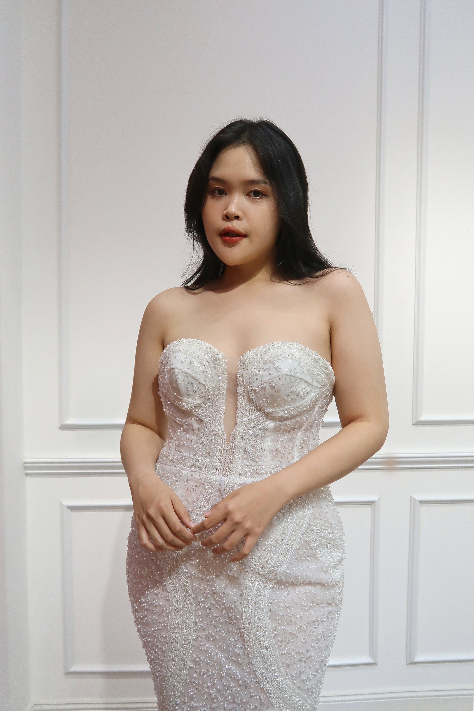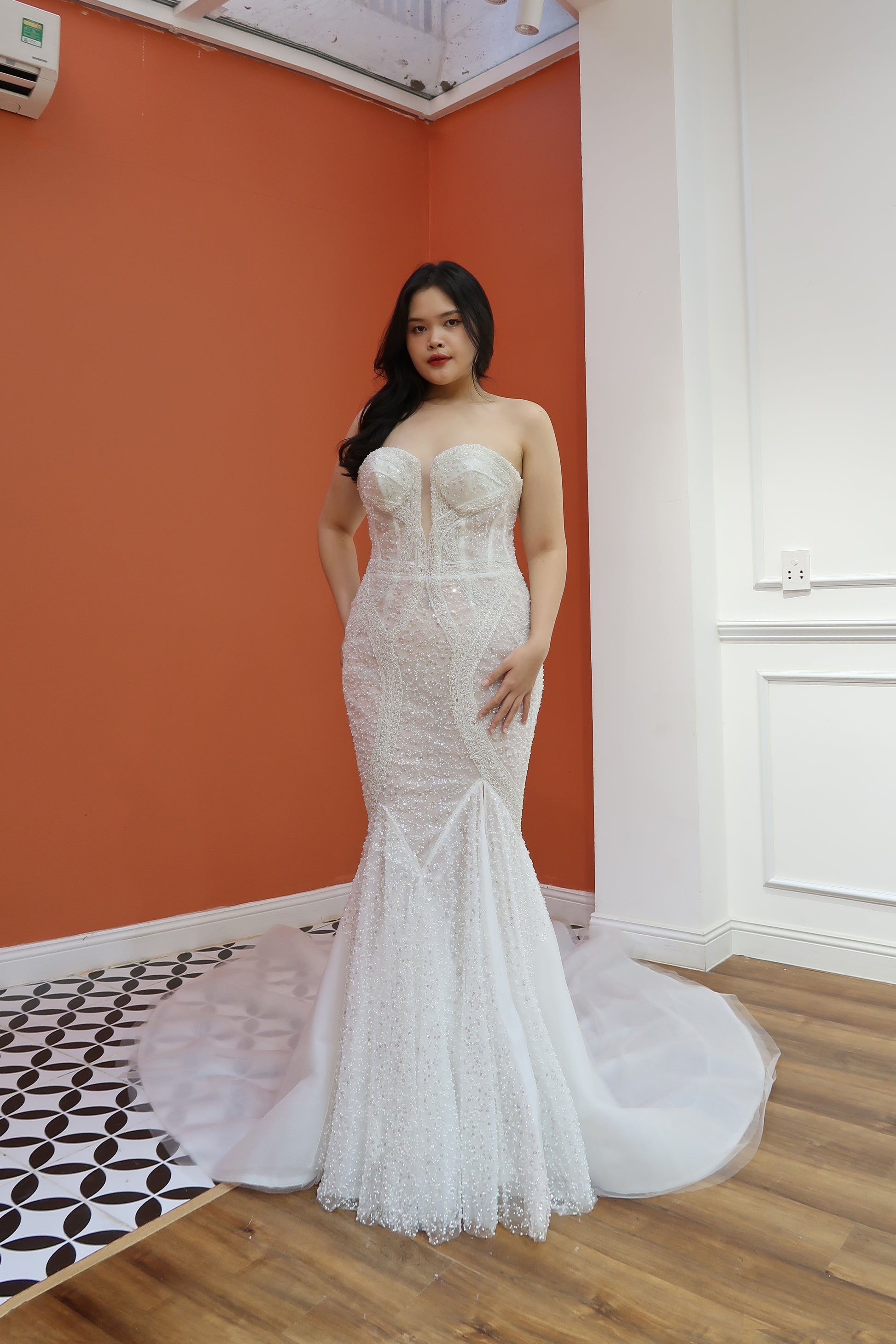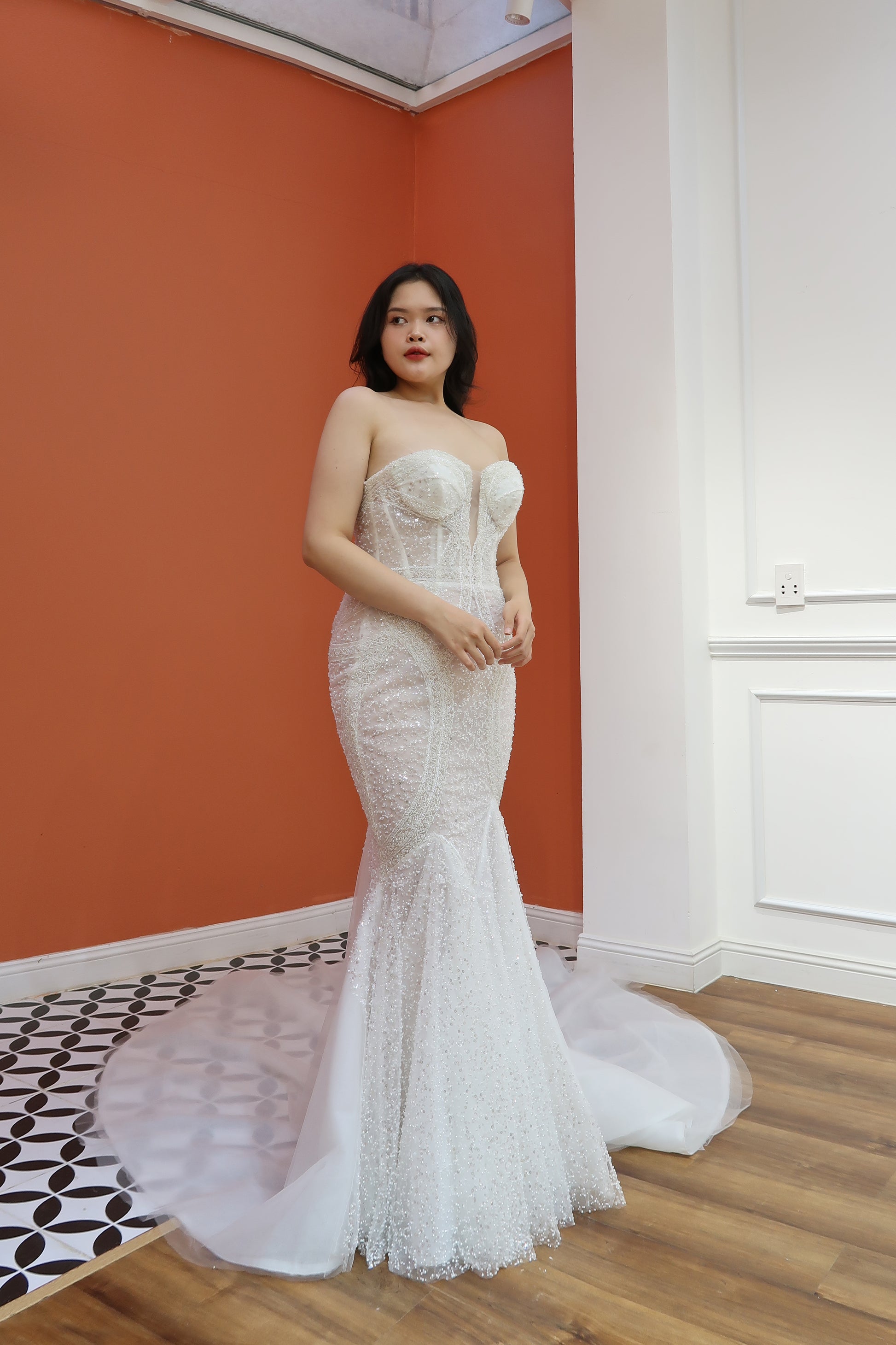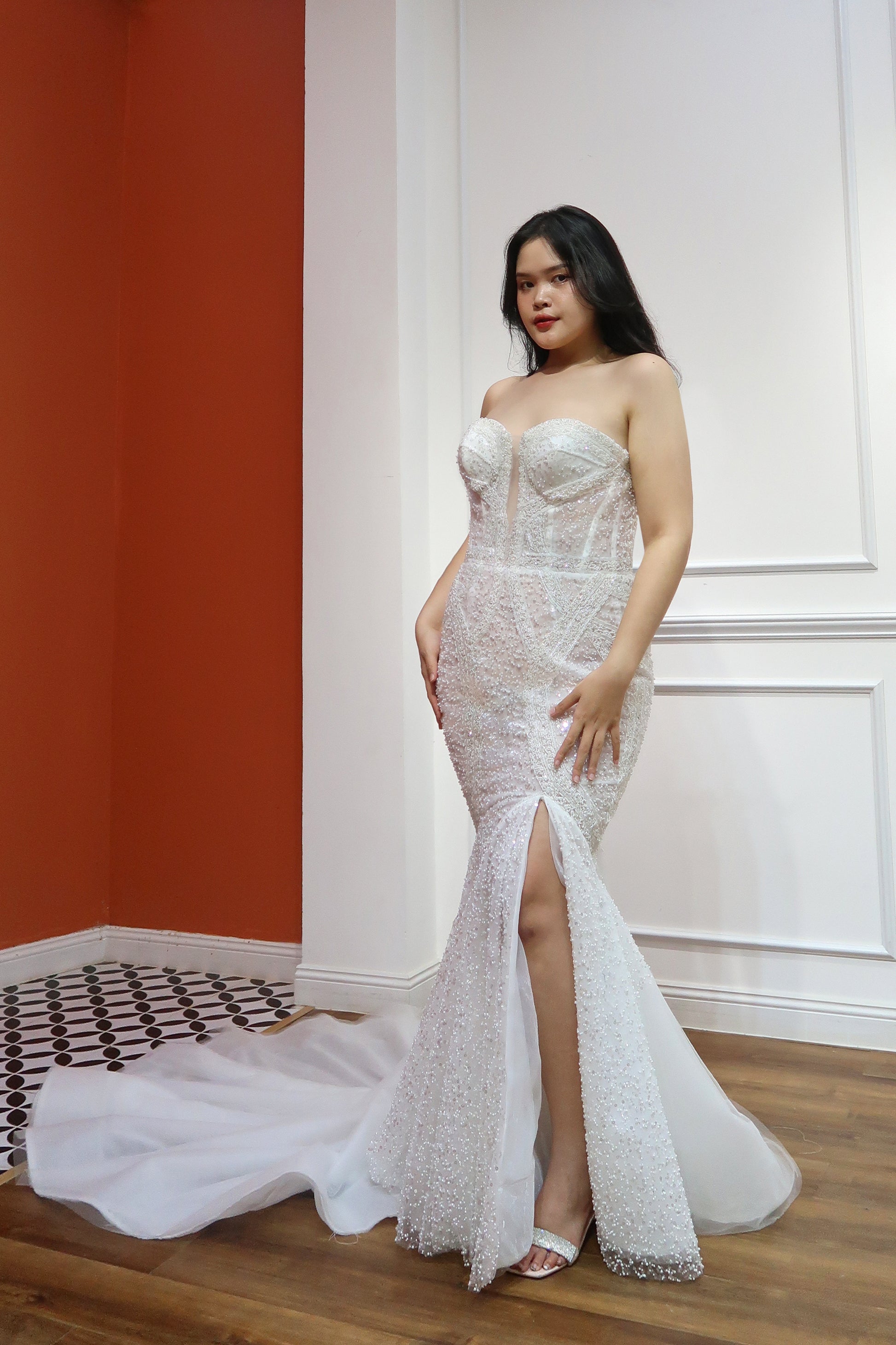 Crafted from an allover beaded fabric, this breathtaking mermaid wedding dress shimmers with every step you take down the aisle. Featuring a side slit and a captivating illusion cut-out neckline, it flatters curves with a sexy mermaid silhouette.